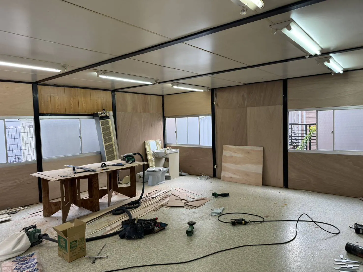 内装のリフォーム工事が終わったら、リビングテーブルに長机や椅子、パーテーションに事務机、パソコン、冷蔵庫、電子レンジを入れる予定です。