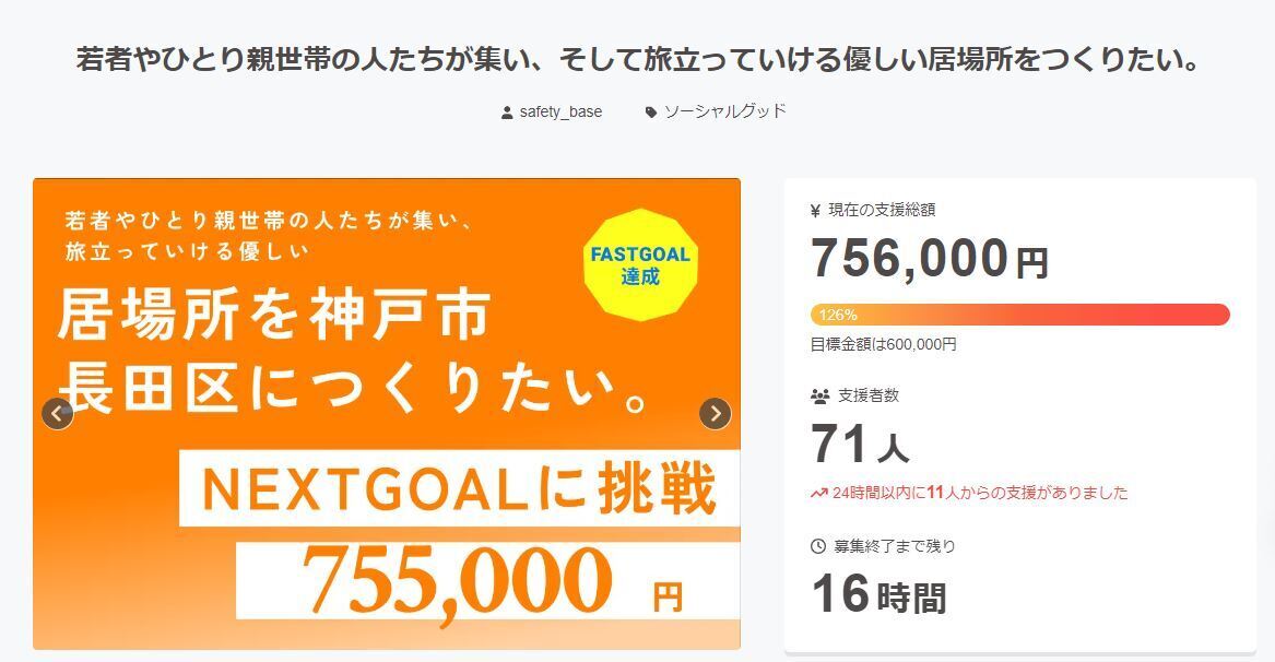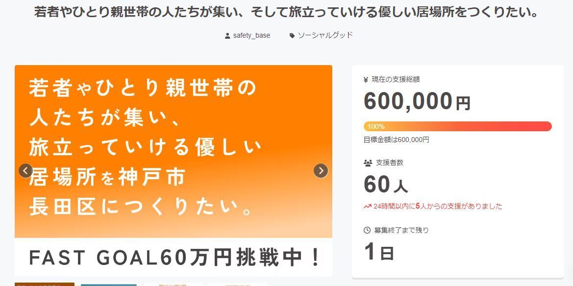 皆さん、おはようございます。クラウドファンディング、今日と明日を残して目標金額60万円を達成することが出来ました!!皆さんが私たちの活動を応援していただいたおかげです。心から感謝申し上げます。ありがとうございます。これでやっと、ご支援いただいた皆さんのお名前を確認することが出来ます。直接お会いしてお話し出来る方、お電話でお話し出来る方。メッセンジャーやLINE、メールで連絡出来る方。このクラウドファンディングのメッセージでコンタクトが取れる方。全員にお礼のメッセージを届けさせていただきます。本日と明日がありますので、ここからはネクストゴールを目指して最後まで頑張ります!ネクストゴール目標金額は755000円です。この内訳はクラウドファンディングページ作成費10万円+看板設置費55000円合計155000円分です。引き続き応援、よろしくお願いします。今回のクラウドファンディングにご支援いただき本当にありがとうございました。NPO法人セーフティベース 山中孝一