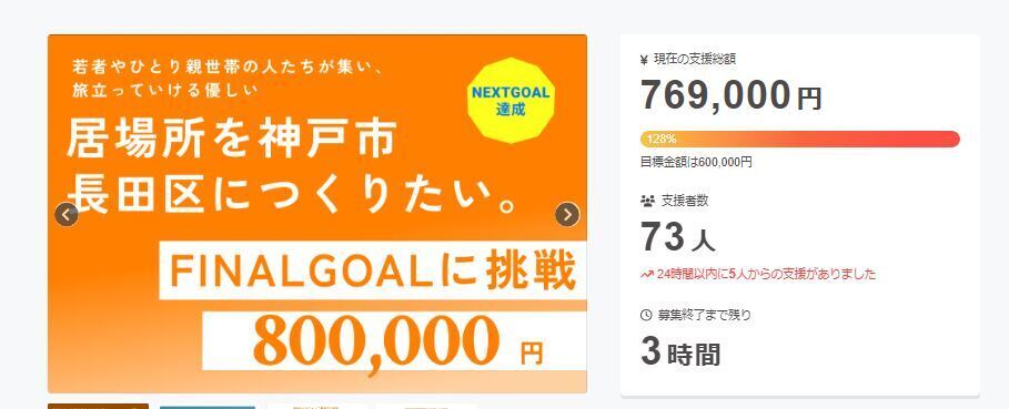 皆さん、こんばんは。クラウドファンディング、終了まであと3時間となりました。ファイルゴール80万円まであと3万1000円となりました!!あと少しで完全目標達成です!!!ここまでこれたのも応援していただいた皆さんのおかげです。ありがとうございます!!ここまで来たら、ファイルゴールまで駆け抜けたいです。あと、3万1000円今回最後のご支援よろしくお願いします。PS:本日看板設置を除きリフォーム工事が終わりました。また、別の報告書で再度ご報告させていただきます。