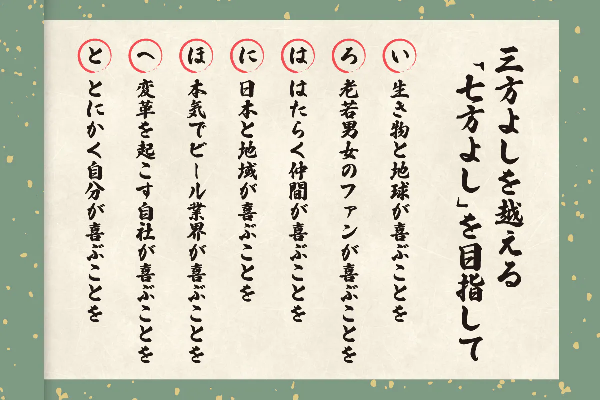私たちは七方良しという価値観に則って活動しています。七方良しとは、三方良し(売り手良し、買い手良し、世間良し)という言葉を、私たちなりにおもしろくした価値観で、