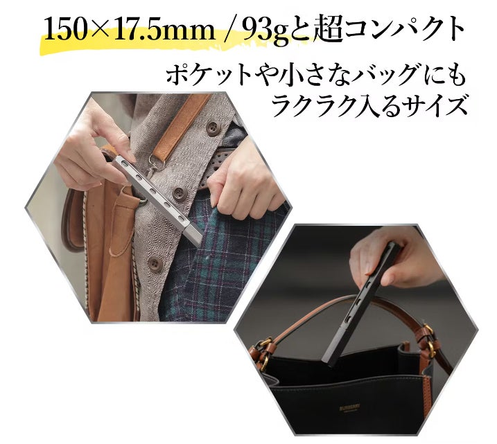 最後に、150×17.5mmのサイズと93gの軽量さは、使う人のライフスタイルに合わせて取り入れやすくなっています。ポケットに忍ばせておいても違和感なく、いつでもどこでも手軽に使えることが、mininchの大きな魅力です。