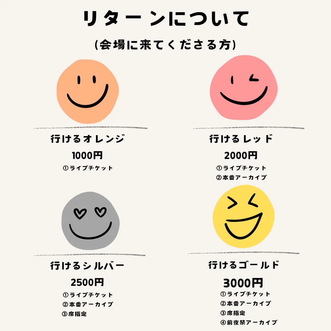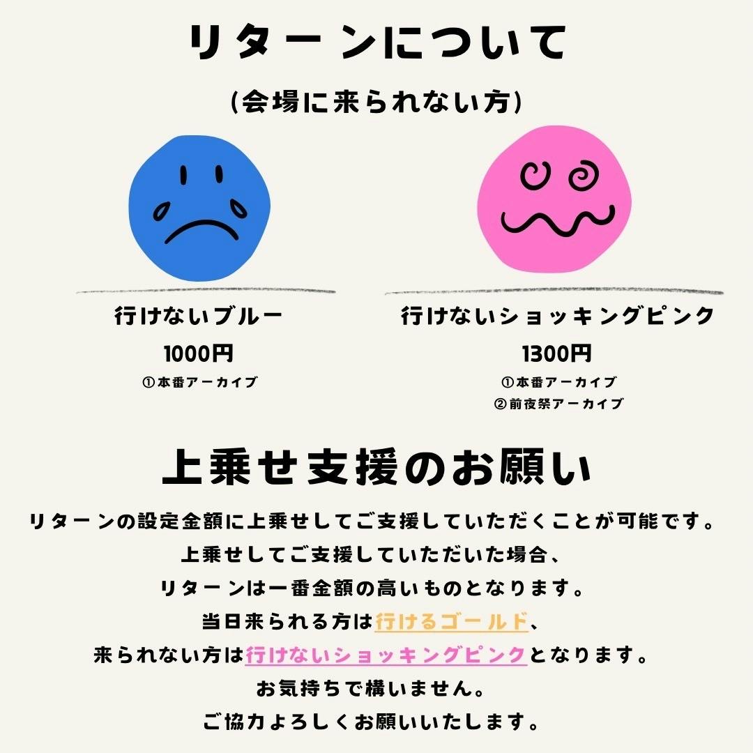 支援してくださった方々には、当日のチケット付きのリターンや、チケットがいらない方用のリターンもご用意しております。3000円以上の支援はリターンが全て同じものとなるため、ご注意ください。また当日の席指定は購入順にメールにて指定をお伺いするため、希望の席にならない場合もございます。
