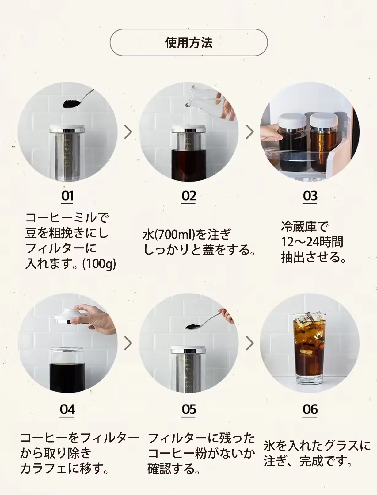SHELBRUは水と粗挽きまたは中粗挽きのお気に入りのコーヒー豆を入れて1日冷蔵または常温保存するだけ。