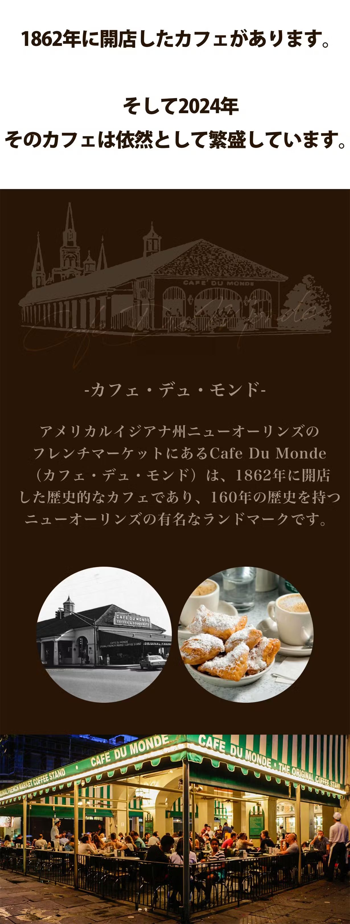 Cafe Du Monde(カフェデュモンド)ニューオーリンズコーヒーはアメリカ合衆国ルイジアナ州ニューオーリンズにある有名なカフェで提供される特別なブレンドのコーヒーです。