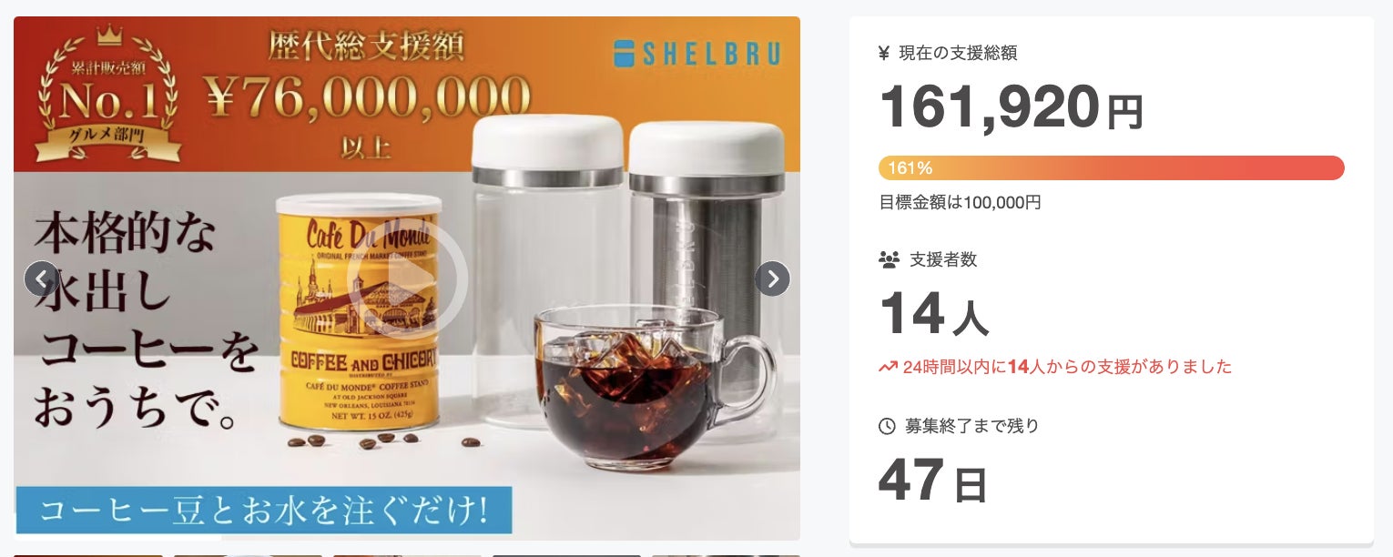 この度は「【累計出荷数1万個以上】"本格派" の水出しコーヒーシステム◎第3弾として再登場!」に支援頂き誠にありがとうございます!お陰様で、開始から30分で10万円の目標金額を100%達成することができました。>>> クーポンのURLはこちら <<<※公開日からクーポンリンクが使用できます。ステンレス素材のダブルフィルター技術を採用し、自宅で簡単にまろやかで美味しい濃縮アイスコーヒーを作ることができるSHELBRUのコールドブリューボトル!SHELBRUはコーヒー豆と水を注ぐだけで簡単。できたコーヒーは蓋を変えるだけで簡単に注ぐことができ、すぐにまた次のコーヒーが作れる!ご興味のある方、ぜひ支援お願い致します。https://camp-fire.jp/projects/790101/viewBrightチームは、当プロジェクトをもっと多くの方に知っていただきたいと考えております。よかったら、FacebookやTwitter等のSNSでのシェア・拡散をお願い致します。#shelbru #brightdiyどうぞよろしくお願い致します。Brightチーム
