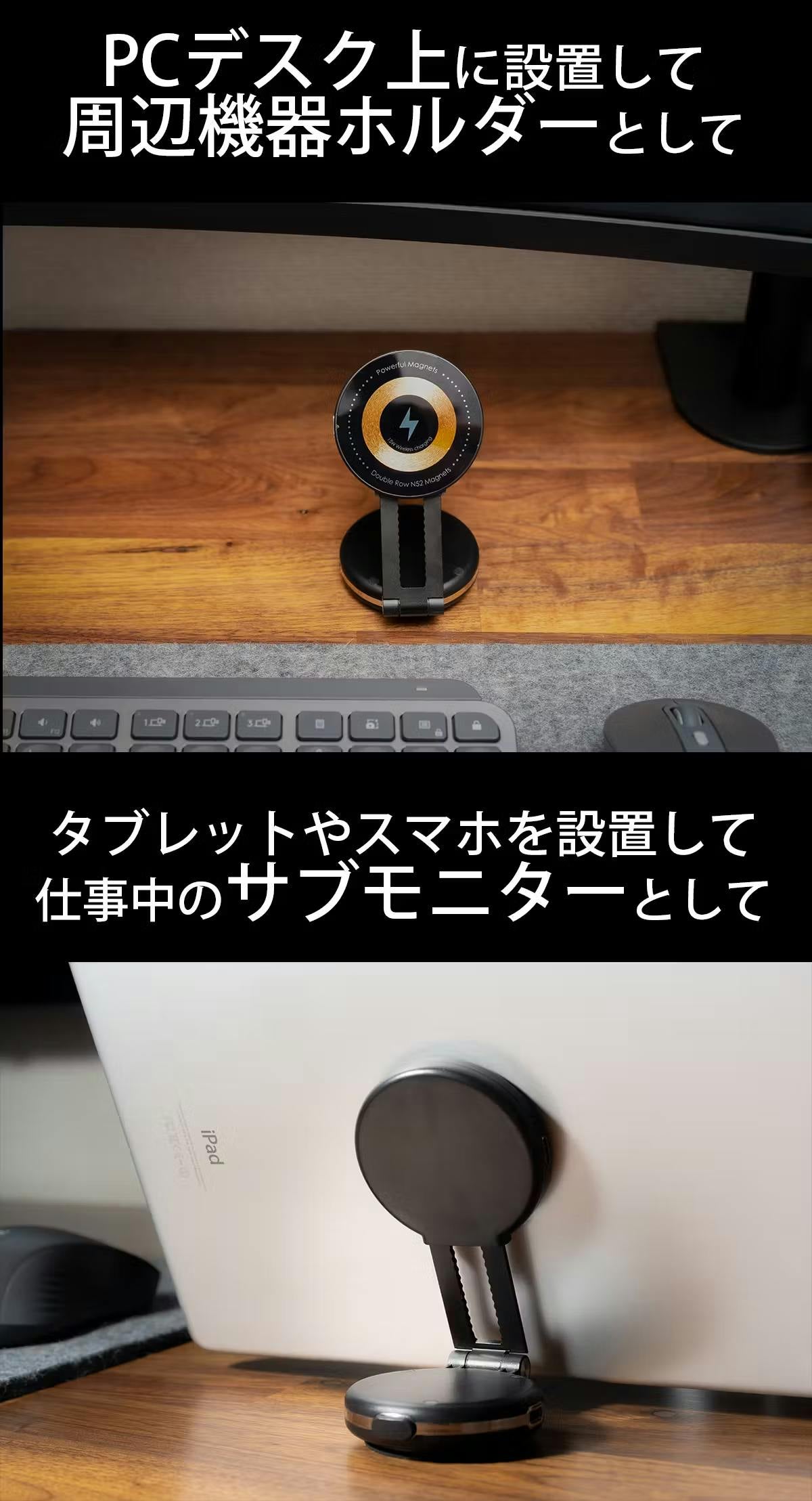 <真空吸着による強力な固定で、平滑面に簡単に取り付け可能。設置面を傷つけず跡も残さないため、どこでも安心して使用できます。 さらにワイヤレス充電機能も搭載!スマホを置くだけで充電できます。 コンパクトに折りたためるので持ち運びにも便利です。スマホやタブレット生活がより快適になること間違いなし!>