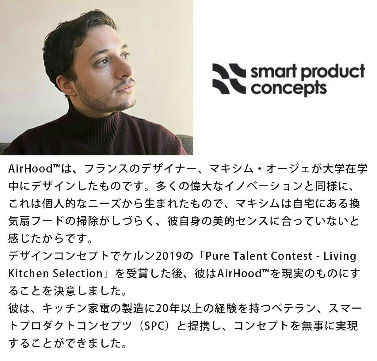 AirHood™は、フランスのデザイナーMaxime Augay(マキシム・オージェ)がデザイン。キッチン家電の製造に20年以上の経験を持つSmart Product Concepts社と提携し完成しました。