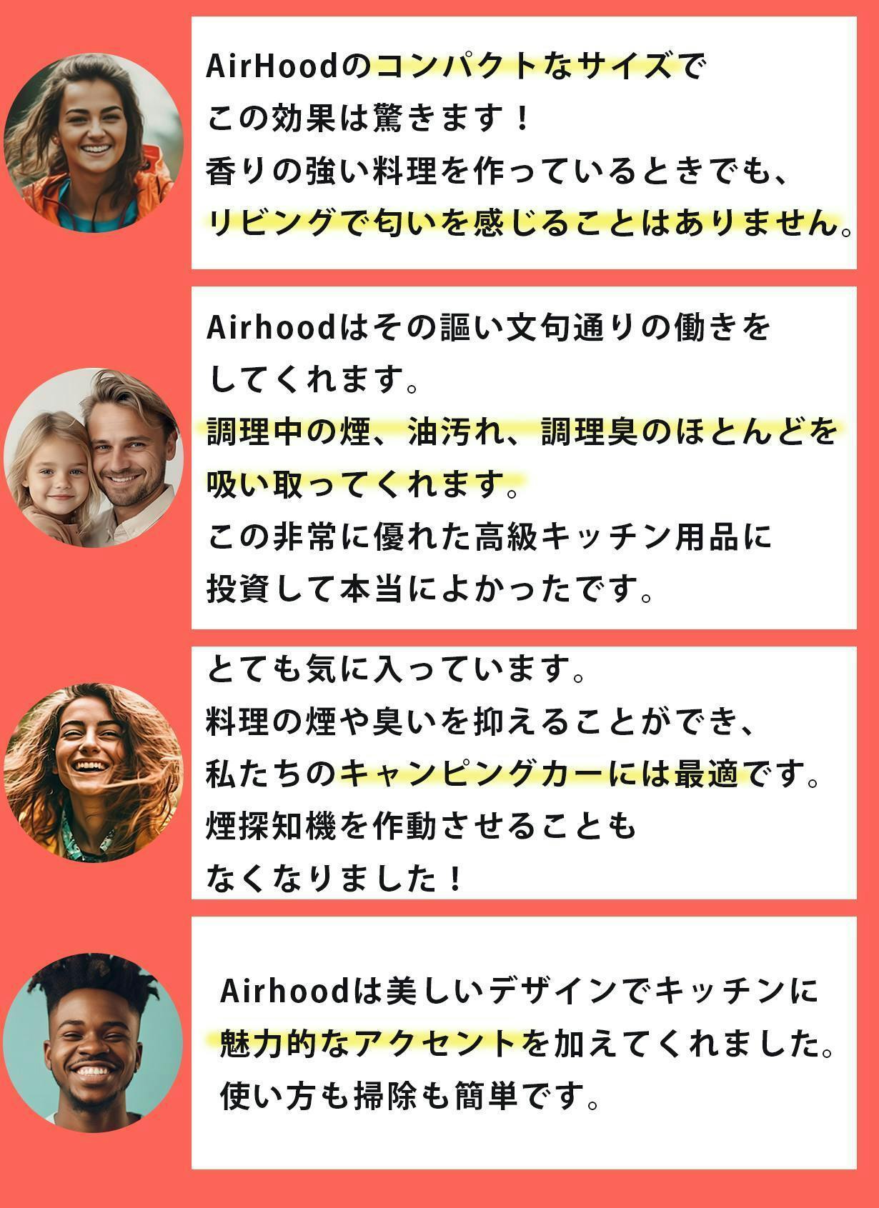 A. 排気した空気を別の場所に向けるのではなく、Airhoodの背面から排出され、非常に効率的に再循環させます。