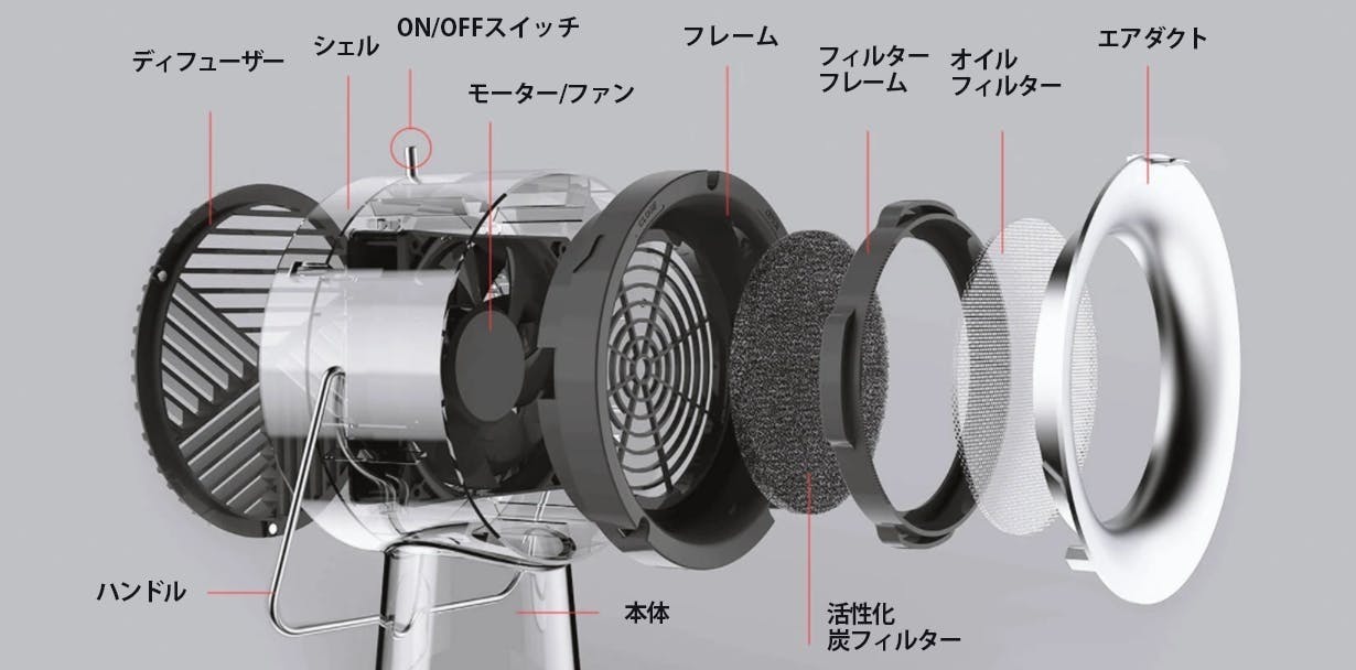 強力な換気扇が料理の煙を吸い込み活性炭フィルターを通します。スペアも付属しており数カ月間使用できます。