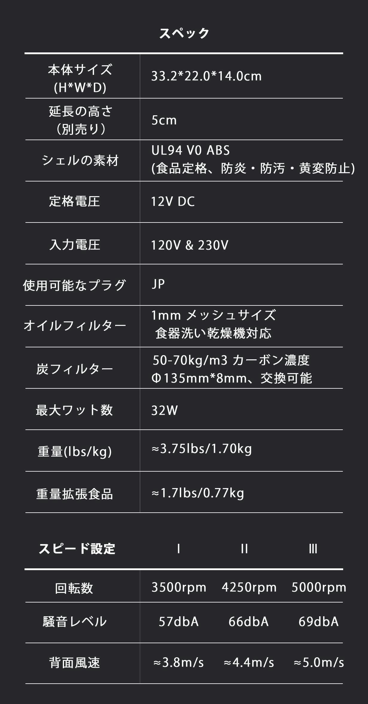 みなさんのご自宅の換気扇の音はどうでしょうか?Airhoodはレベル1〜レベル3で57dbA〜69dbA程度です。