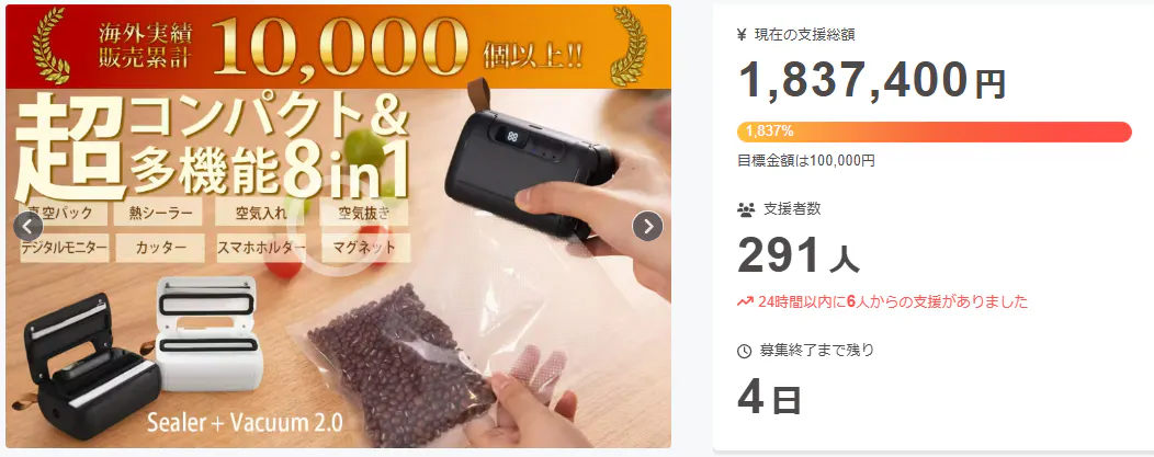 この度は「累計出荷数1万個◎真空パックできて液体保存も可能!超コンパクトな8in1シーラー」に支援頂き誠にありがとうございます!