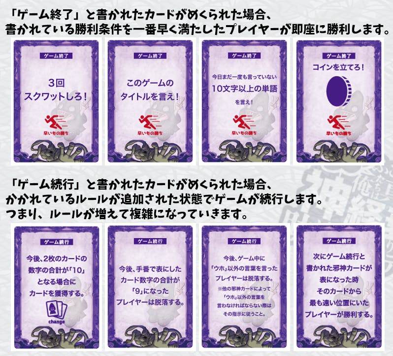 邪神カードがめくられたら、その時点でカードの記載通りにルールが変更になります。