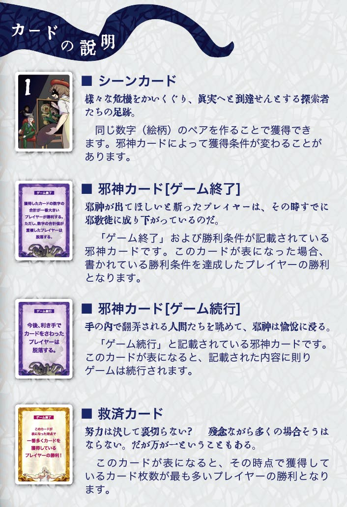 邪神カードは44種類(1枚ずつ)、救済カードは6枚(内容は同一)が同梱されています。