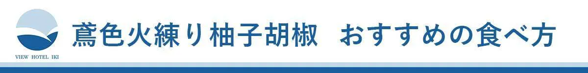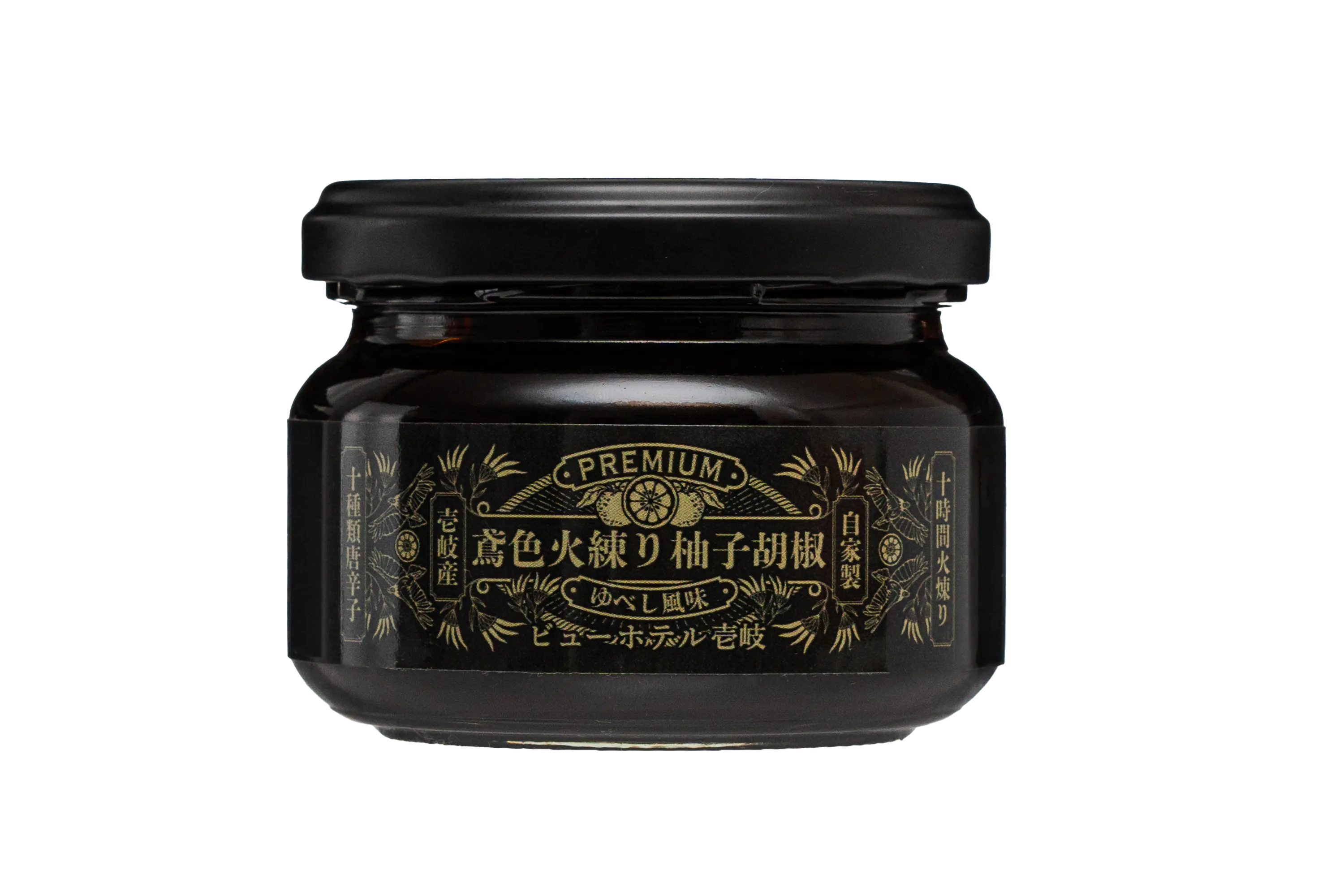 鳶色火練り柚子胡椒は、ビューホテル壱岐オリジナルの薬味。ご覧の通り、一般的な柚子胡椒と違って鳶色(鳶の羽根のような茶色)をしています。壱岐島の伝統薬味「ゆべし」を独自の解釈で進化させた、当ホテルオリジナルの新しい薬味です。