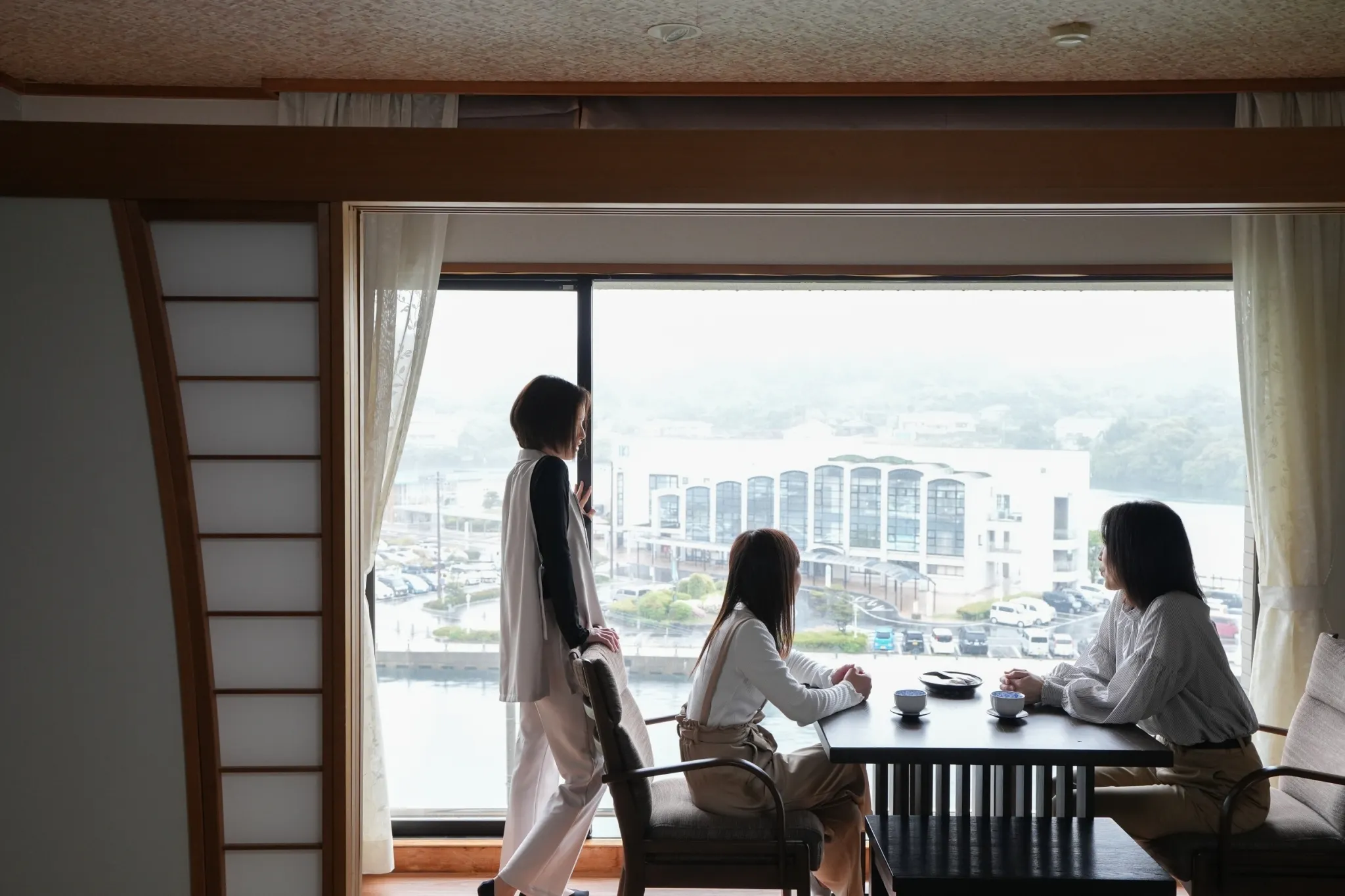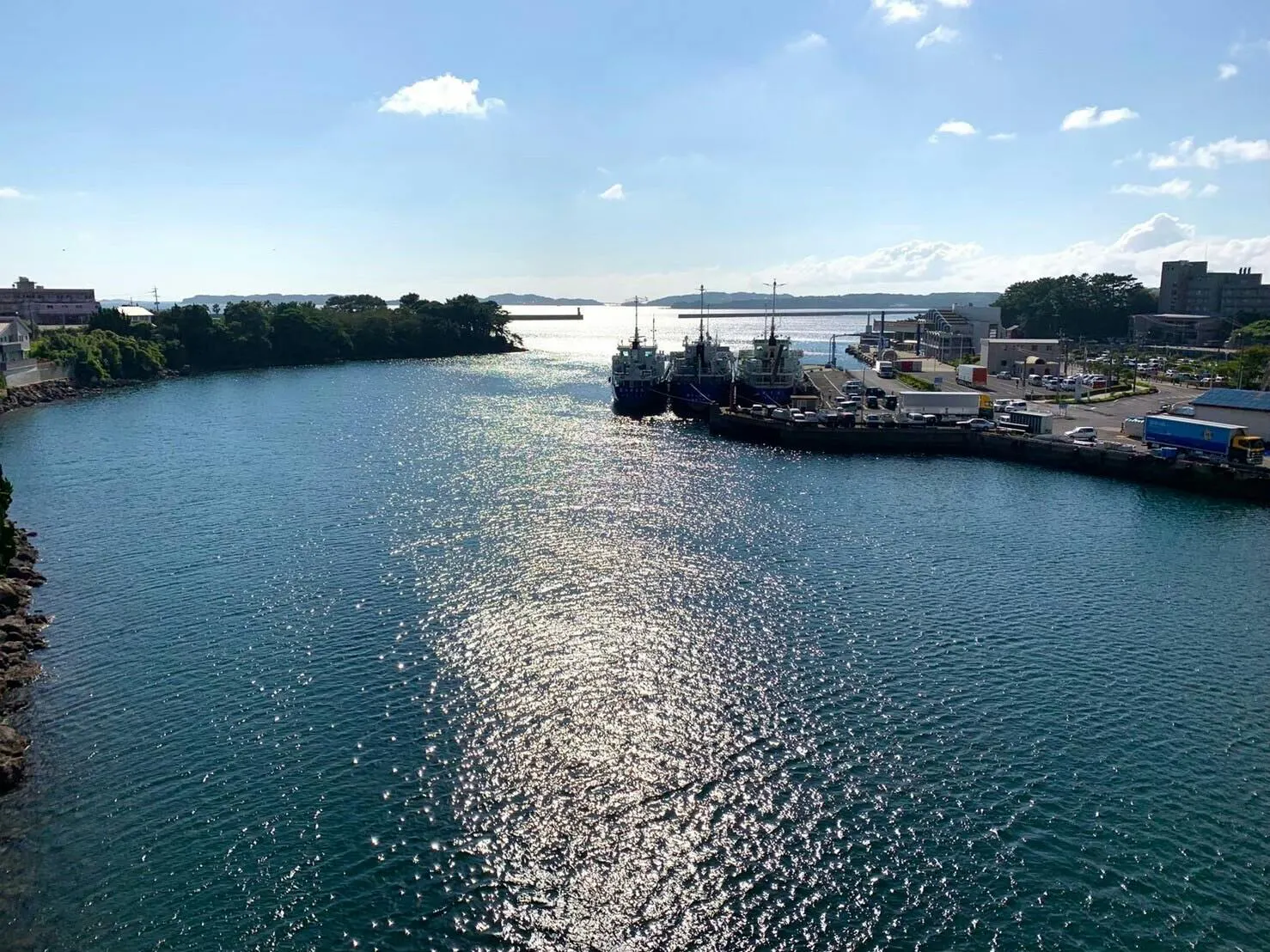 客室の窓からは港を行き交う船を眺められ、さながら目の前で繰り広げられる迫力満点のショーのよう!ホテル横の防波堤から見る夕陽は絶景です。