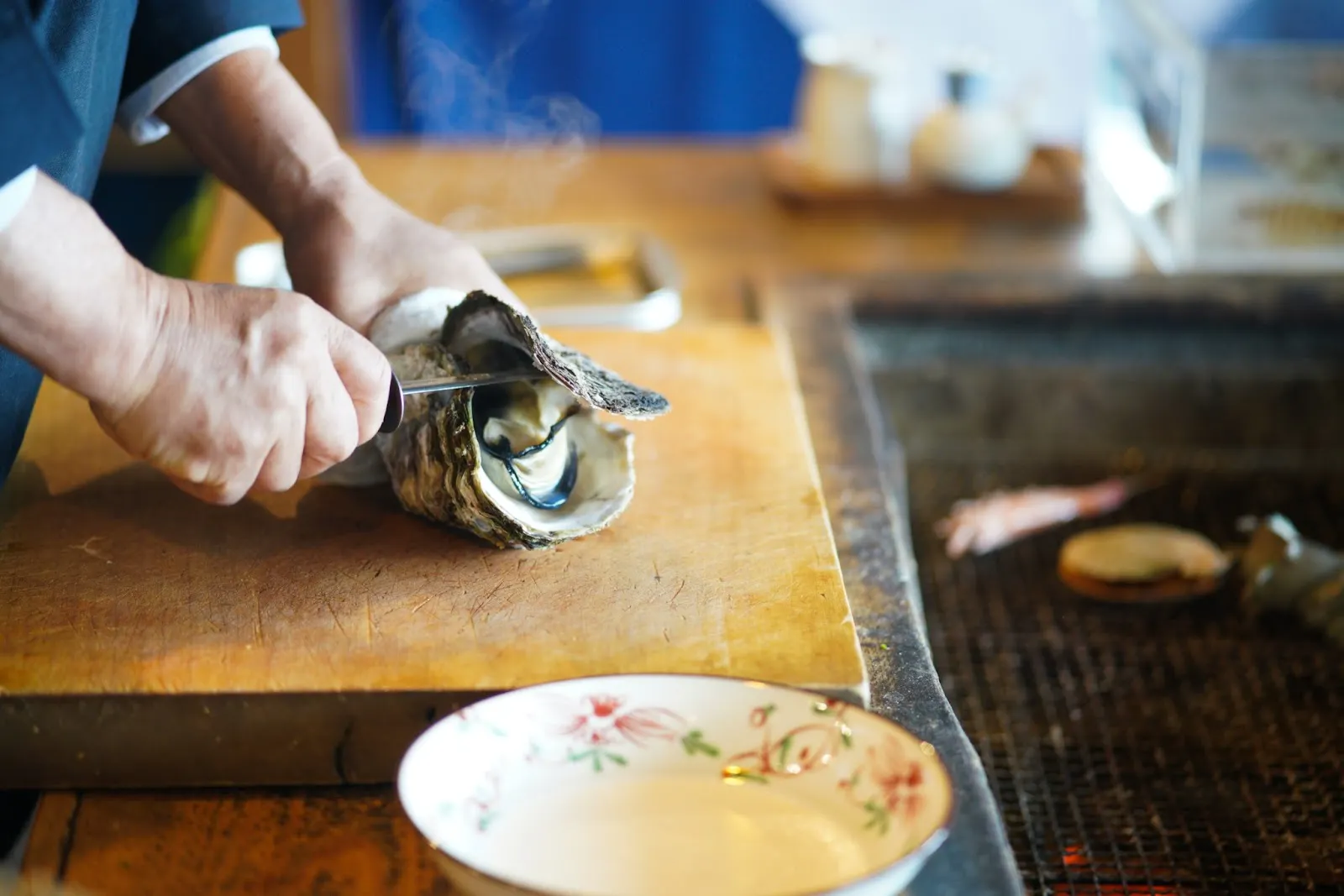 一番人気のプラン「磯あそび懐石」では、目の前の水槽で泳ぐ車海老や動く貝類をご覧いただいた後、職人が大きな囲炉裏で丁寧に焼き上げます。生きた食材を目の前にして磯遊びのような気分を楽しめ、多くのお客様からご好評をいただいています。