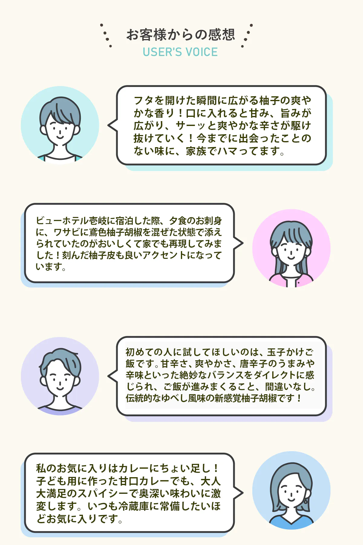 素材のおいしさを引き立て、料理に奥深さをもたらす鳶色火練り柚子胡椒。お客様からもこんな感想をいただいています。