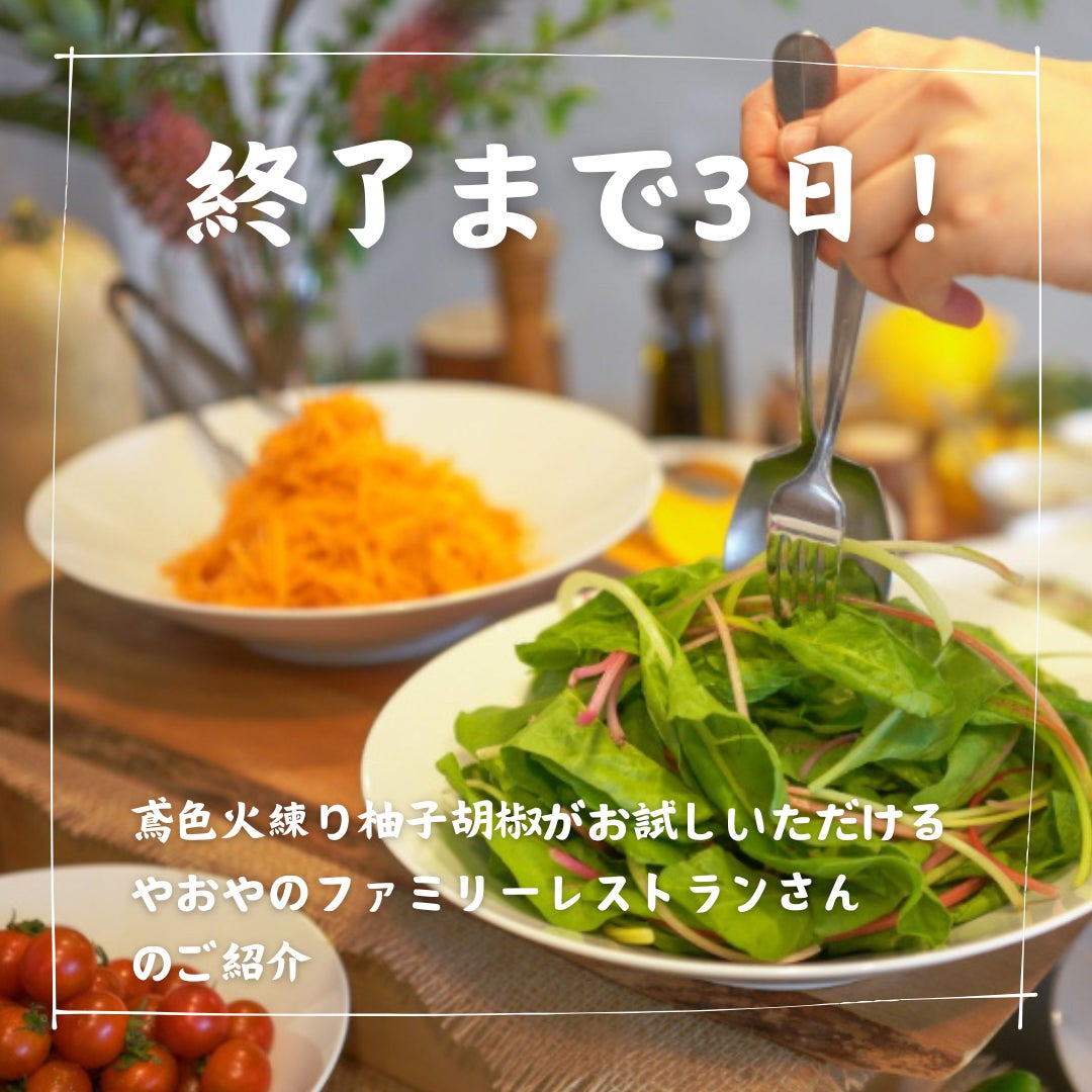 終了間近!クラウドファンディング残り2日です!皆様いつも応援ありがとうございます今朝は鳶色火練り柚子胡椒をクラファン期間中ご紹介頂いております東京都三軒茶屋『やおやのファミリーレストラン』さんのご紹介ですやおやのファミリーレストランさんは市場ではなく、信頼できる農家さんから仕入れる八百屋をつづけて10年。旬のオーガニック野菜や伝統野菜を活かしたサラダバーを中心に、40種を超えるメニューを提供します。育ち盛りのお子さまはもちろん、大人の方にもご満足いただけるよう、素材にこだわり丁寧に料理されているレストランです先日私もお邪魔させて頂きましたその名の通り、大人も子供も大満足のオシャレなファミリーレストラン子供も安心の床ふかふか小上がりテーブル席もあり、安心して親子で楽しめますこだわりのサラダバーに鳶色火練り柚子胡椒のお試しを置いて頂いております私は三元豚の味噌漬け焼き 香味野菜添えを頼んでみましたが豚がすごく柔らかくてびっくり!そしてそこに鳶色火練り柚子胡椒もチョンとのせて食べてみましたがこれはとってもあう!鳶色火練り柚子胡椒は万能的にいろんなものにあいますが、お肉と合わせると、まろみが出て甘味がましてとても美味しいのでお勧めですやおやのファミリーレストランさん是非またうかがわせて頂きます魚や肉、豚汁なんかに落としても美味しい万能薬!食べたことのない壱岐島にしかない新しい味が口の中に広がります是非応援頂けますとうれしいですさて、残り2日!引き続き頑張ってまいります!!やおやのファミリーレストランさんのHPはこちら↓https://yaoyano.com/sancha/