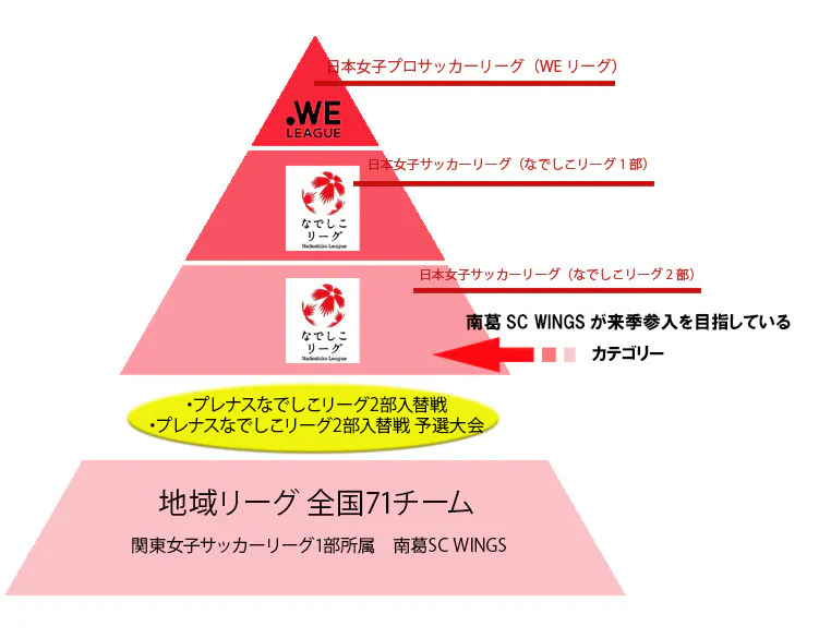 全国に地域リーグは9つあり、私たち南葛SC WINGSは、そのうちのひとつ、関東女子サッカーリーグ1部に所属しています。このリーグは、なでしこリーグの下位リーグに相当します。私たちがなでしこリーグに参入するためには、現在のリーグ戦とは別に、参入戦という大会で勝つ必要があります。