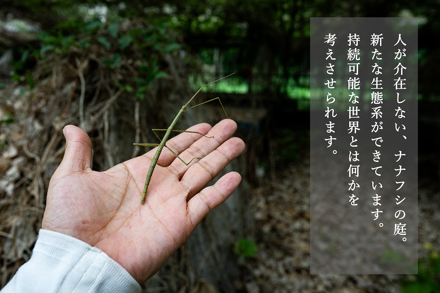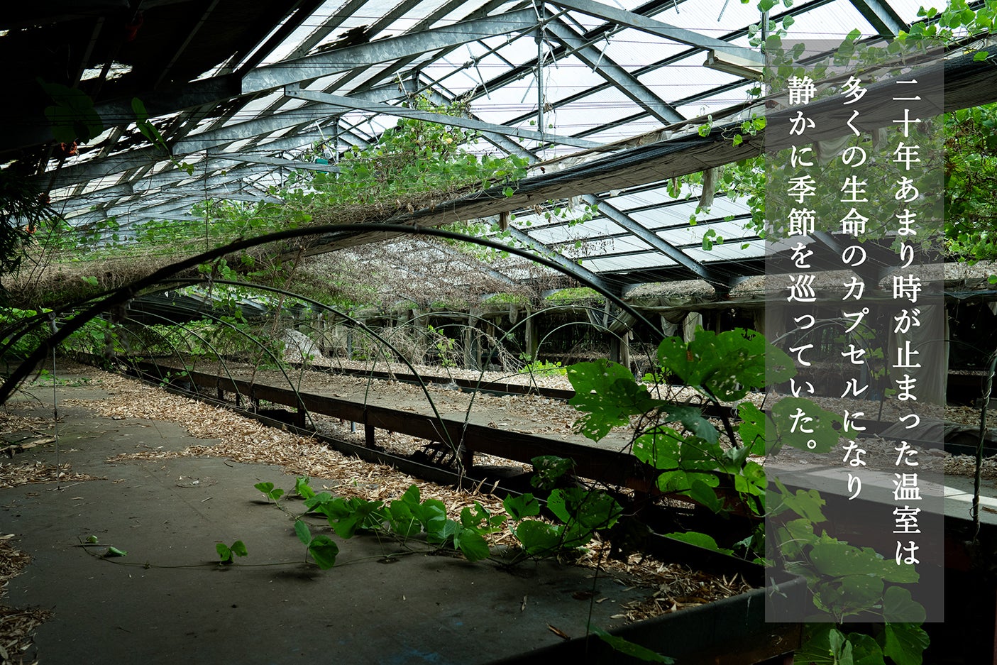 - 時間が止まって約20年間、静かに時を刻む中で温室の中は植物と小さな虫たちの楽園となっていました。ナナフシの庭でもあります。人工物が自然と一体化してきたこの空間を再構築したいと考えます。
