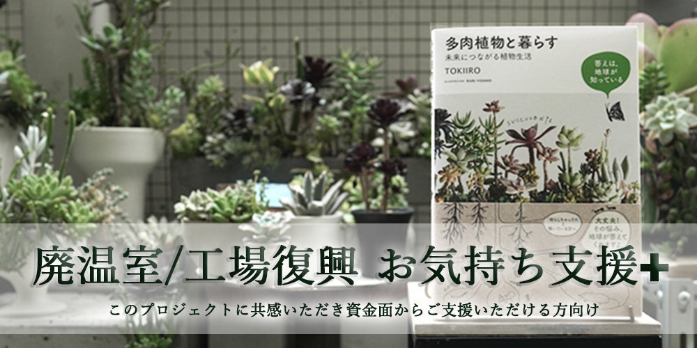活動に共感して頂き、資金面からご支援いただける方向けのリターンになります。(支援金を廃温室・廃工場復興の為に使用させていただきますます)前記の内容にプラスしてT O K I I R O 近藤義展の最新刊『多肉植物と暮らす 未来につながる植物生活』主婦と生活社2024/5の書籍が付きます。プロジェクト終了後に感謝のメッセージをメールにてお送りさせて頂きます。