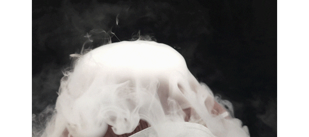 ドライアイスで内部ポーチ生地の通気性を示すテストです。