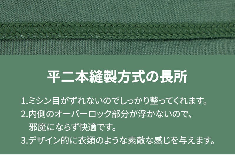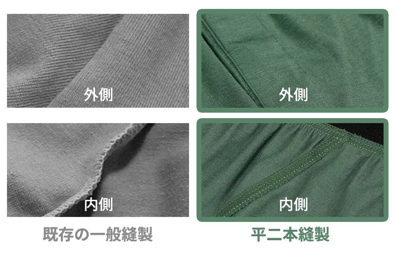 ミシン目を2回施して丈夫で、内側のオーバーロック部分が浮かないので着心地が楽です。