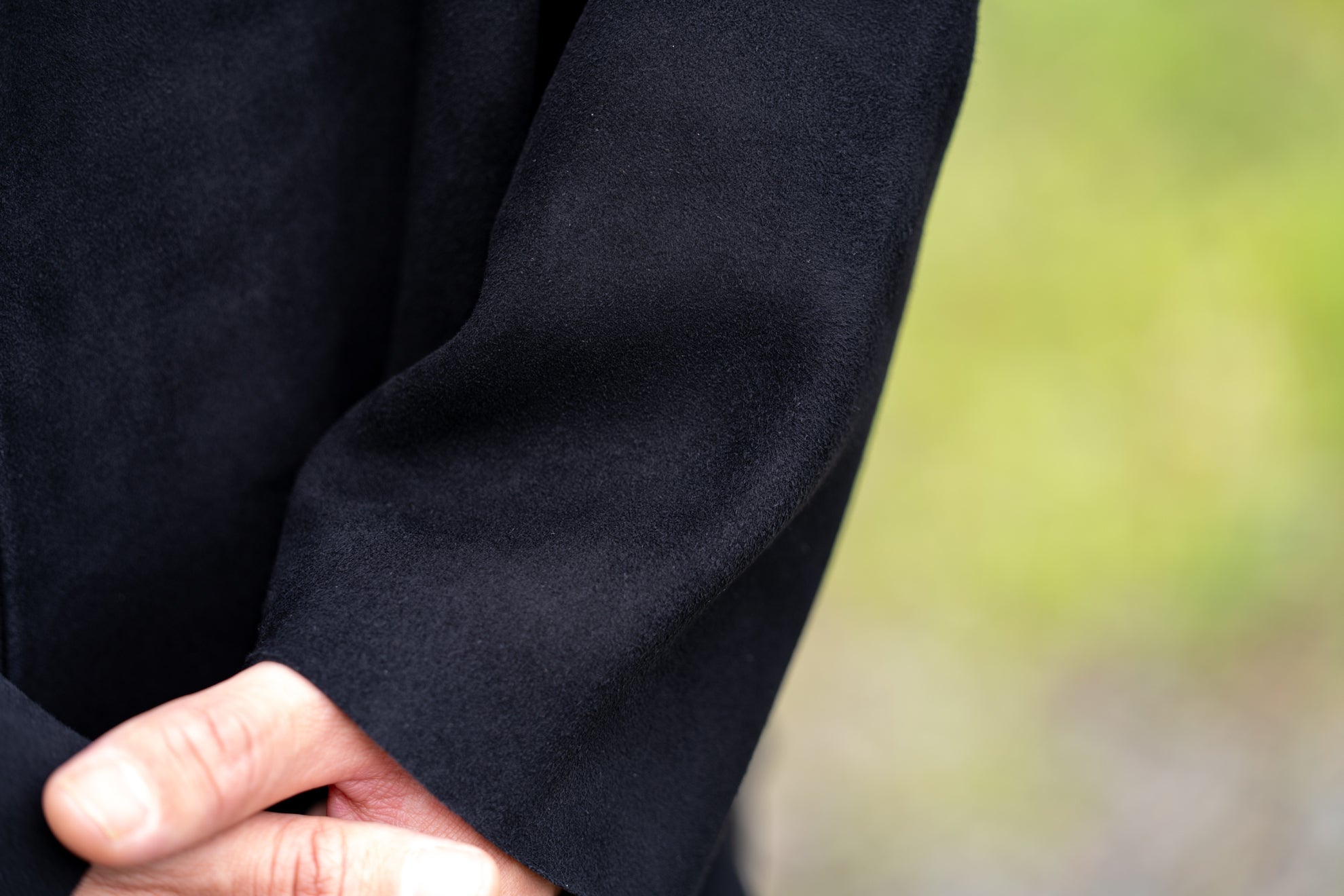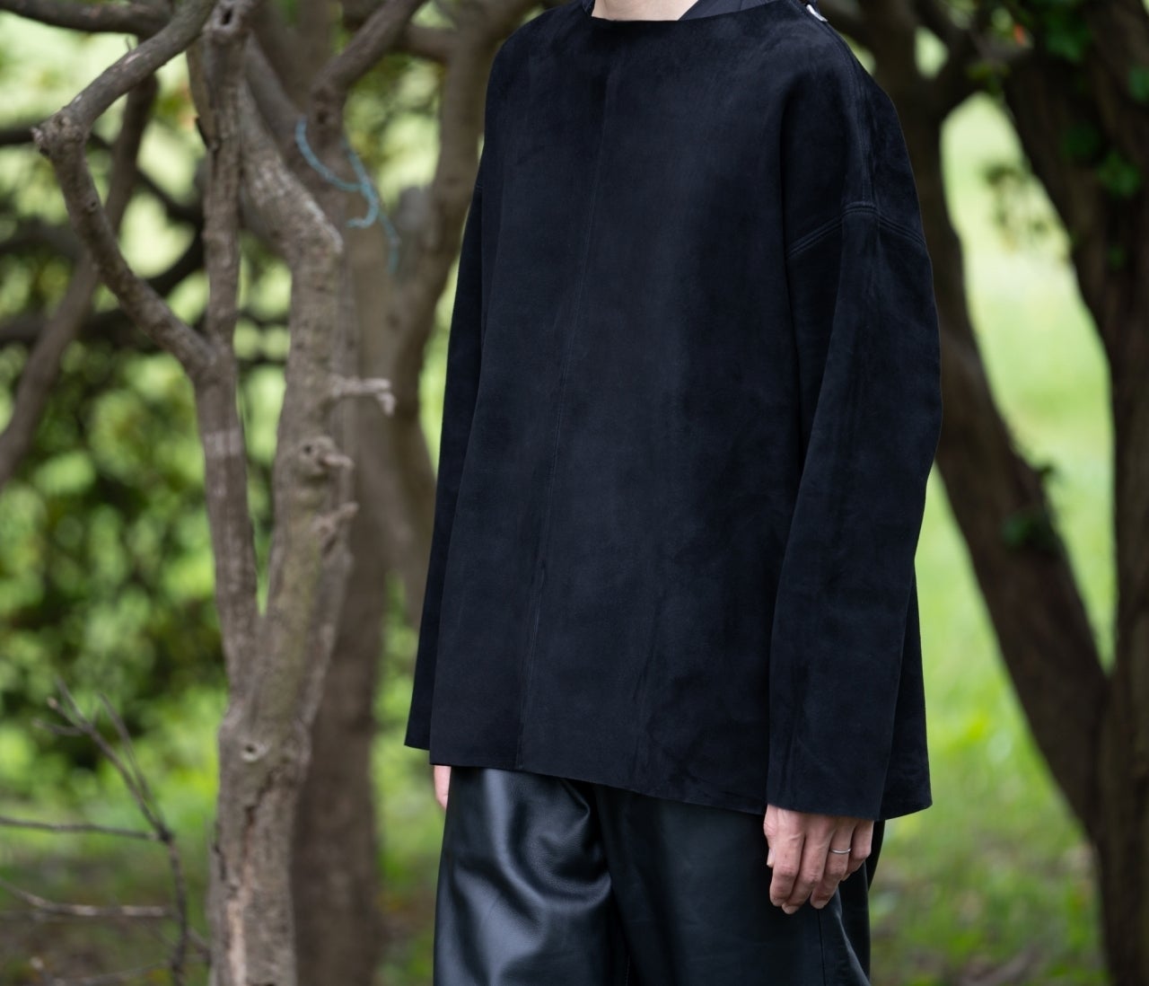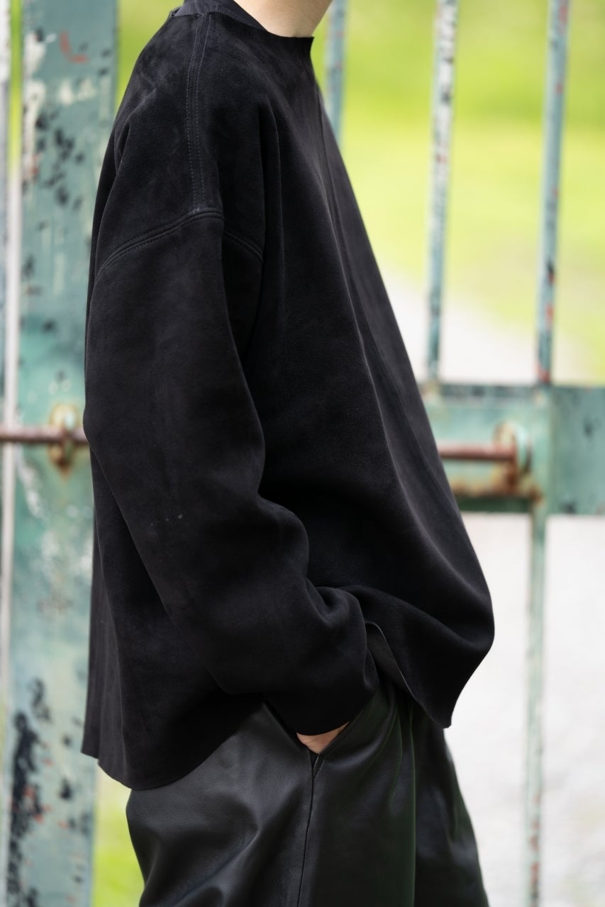 使用している素材はしなやかさと粘り強さを併せ持つシープスキン(羊革)を採用し、色の深みや革の厚み、肌触り、耐久性などすべての点にこだわり、時間をかけて厳選いたしました。「革」という特性を生かし、素材を切りっぱなしで縫製することで適度なドレープ感を出し、レザーでありながらカットソーやスウェットシャツと近い感覚で着れるバランスを追求しました。夏場には向きませんが湿度を適度に吸収しながら風通しを防ぐ特性を持つため春、秋の時期ではアウターとして最適で、冬場にはコートの下にインナーとして着用といった3シーズン使える革衣服としてデザインいたしました。