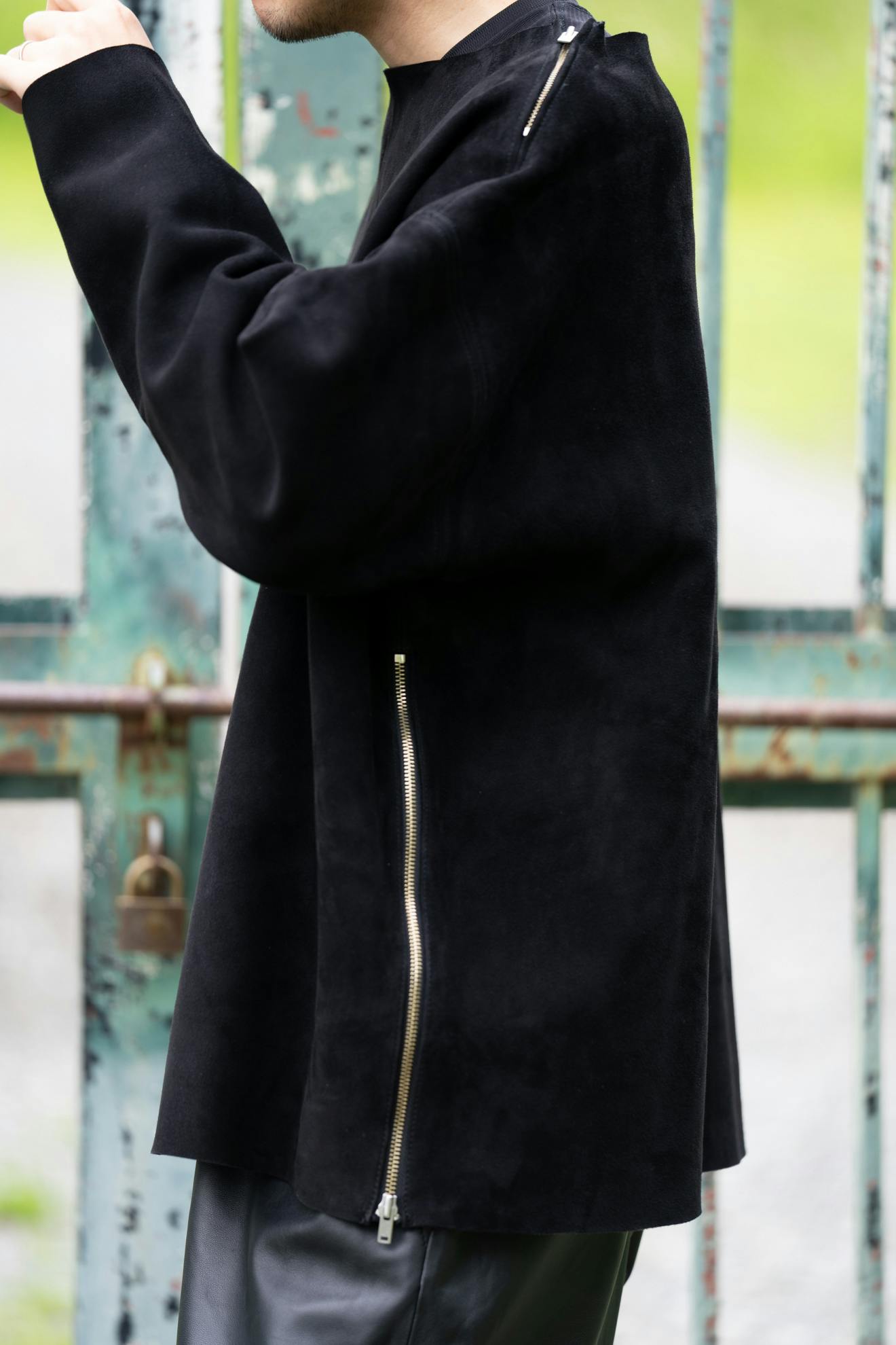 使用している素材はしなやかさと粘り強さを併せ持つシープスキン(羊革)を採用し、色の深みや革の厚み、肌触り、耐久性などすべての点にこだわり、時間をかけて厳選いたしました。「革」という特性を生かし、素材を切りっぱなしで縫製することで適度なドレープ感を出し、レザーでありながらカットソーやスウェットシャツと近い感覚で着れるバランスを追求しました。夏場には向きませんが湿度を適度に吸収しながら風通しを防ぐ特性を持つため春、秋の時期ではアウターとして最適で、冬場にはコートの下にインナーとして着用といった3シーズン使える革衣服としてデザインいたしました。