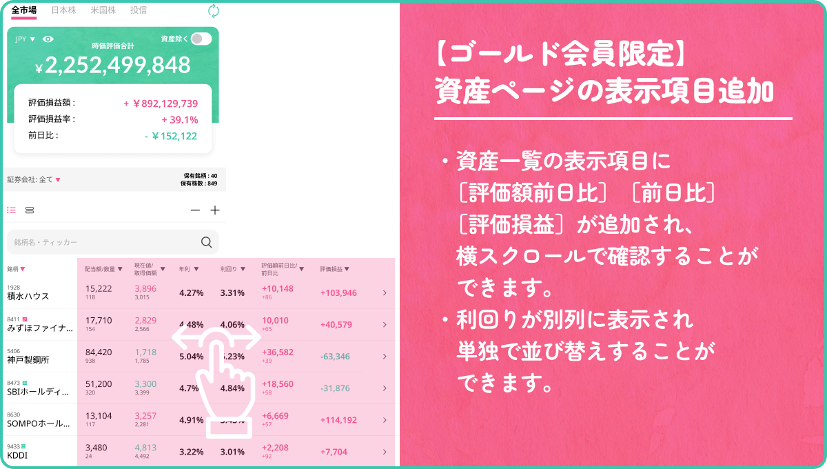 まずはSBI証券さんの保有情報、日本株・米株・投資信託(は少しお時間いただくかも)の保有情報を連携してアプリ内に取り込むことができるようになります。