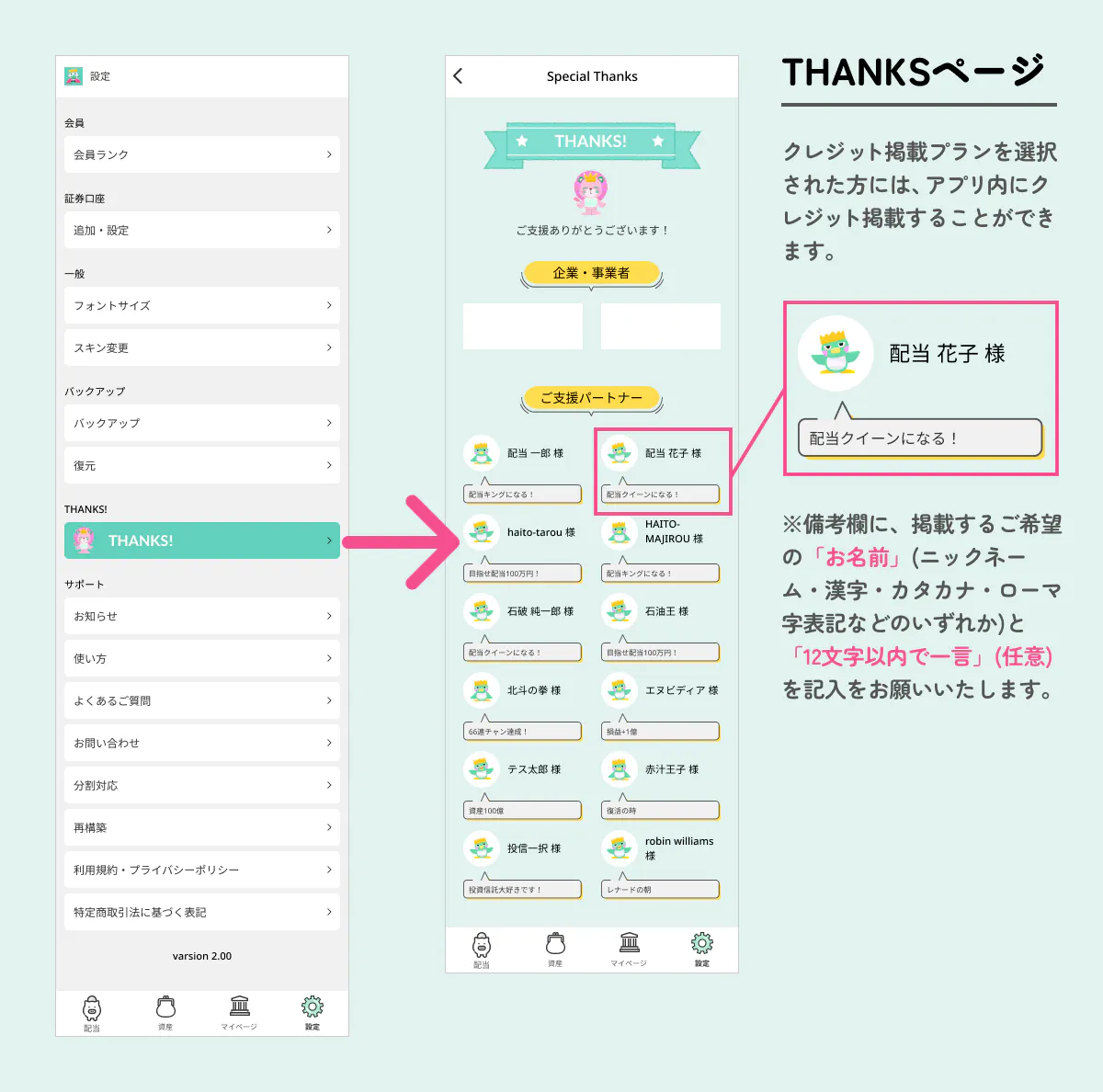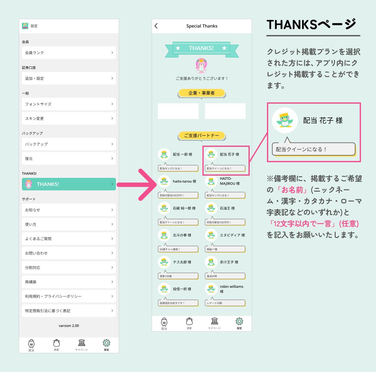 ・アプリ内Thanksページにあなたの「お名前」と「12文字以内で一言」(任意)を1年間掲載します。