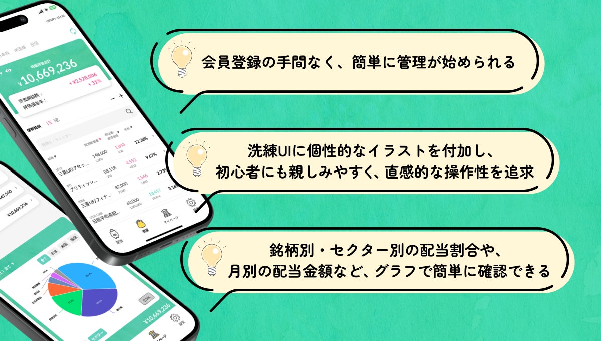 しかし、この難題なテーマの抵抗感を払拭し、配当をコツコツ積み上げることは嬉しい楽しい体験であり、その金銭の下支えが人生を豊かにする1つのきっかけなんだということを世の中に広めることが、アプリ開発チームのミッションだと思っています。