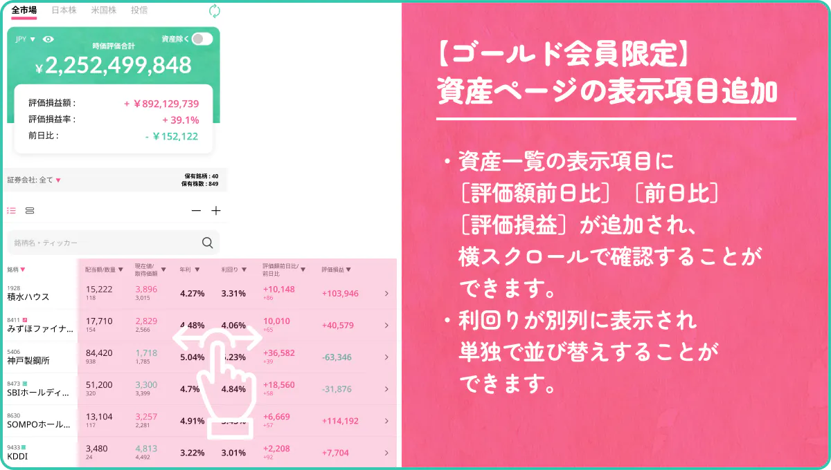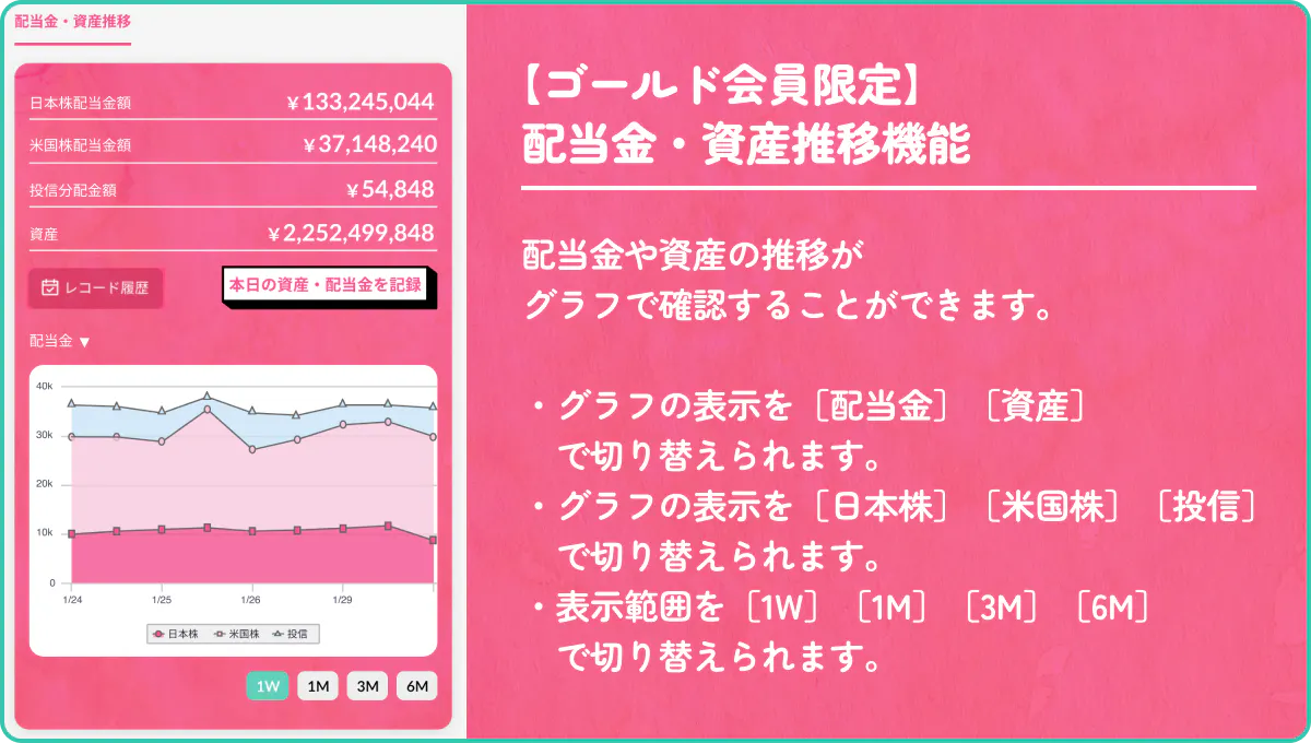 [配当金・分配金]や[投資資産]情報を管理できます。