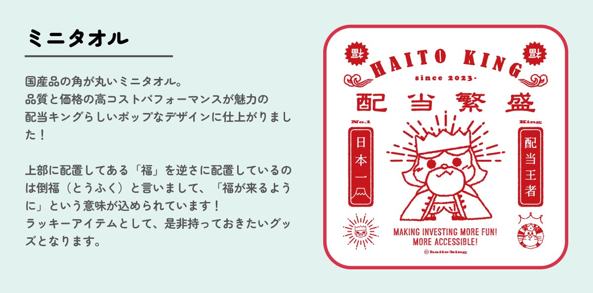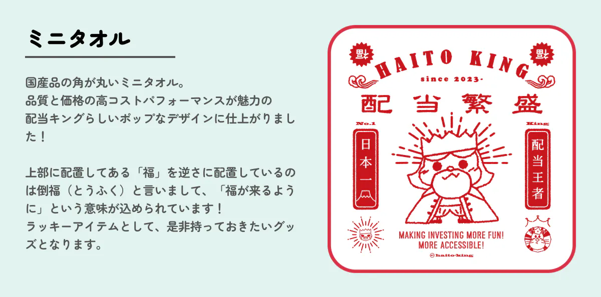 配当王者目指して幸運が訪れる…!?ワントーンで全体をまとめたクラファン限定タオルとなります。