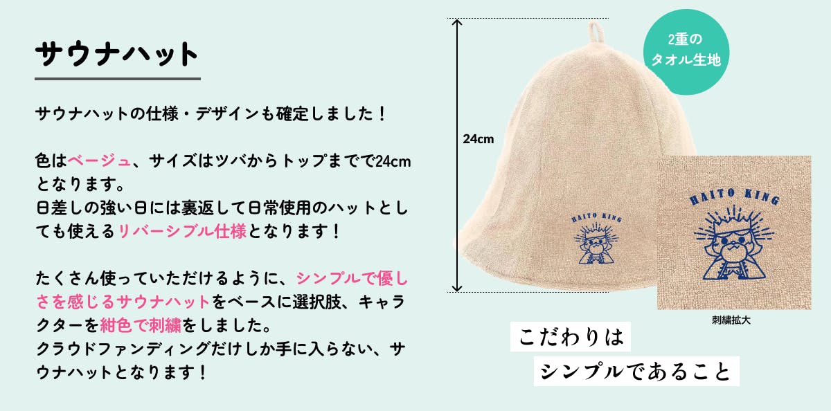 2024/10/24 17:54サウナハットのデザイン完成しました!極力シンプルなサウナハットをベースに選び、老若男女の方がご利用しやすいものとなっております。また、リバーシブル仕様となっておりまして、裏返せば日常用としてもご利用することができます。・ベージュ・タオル生地 2枚重ね・洗濯可能・ツバからトップまで24cm・頭のサイズ54cm~60cm・重さ約90g愛くるしいキャラクターを紺色で刺繍してあります。クラウドファンディング限定サウナハットとなりますので、ぜひご利用いただければと思います! もっと見る