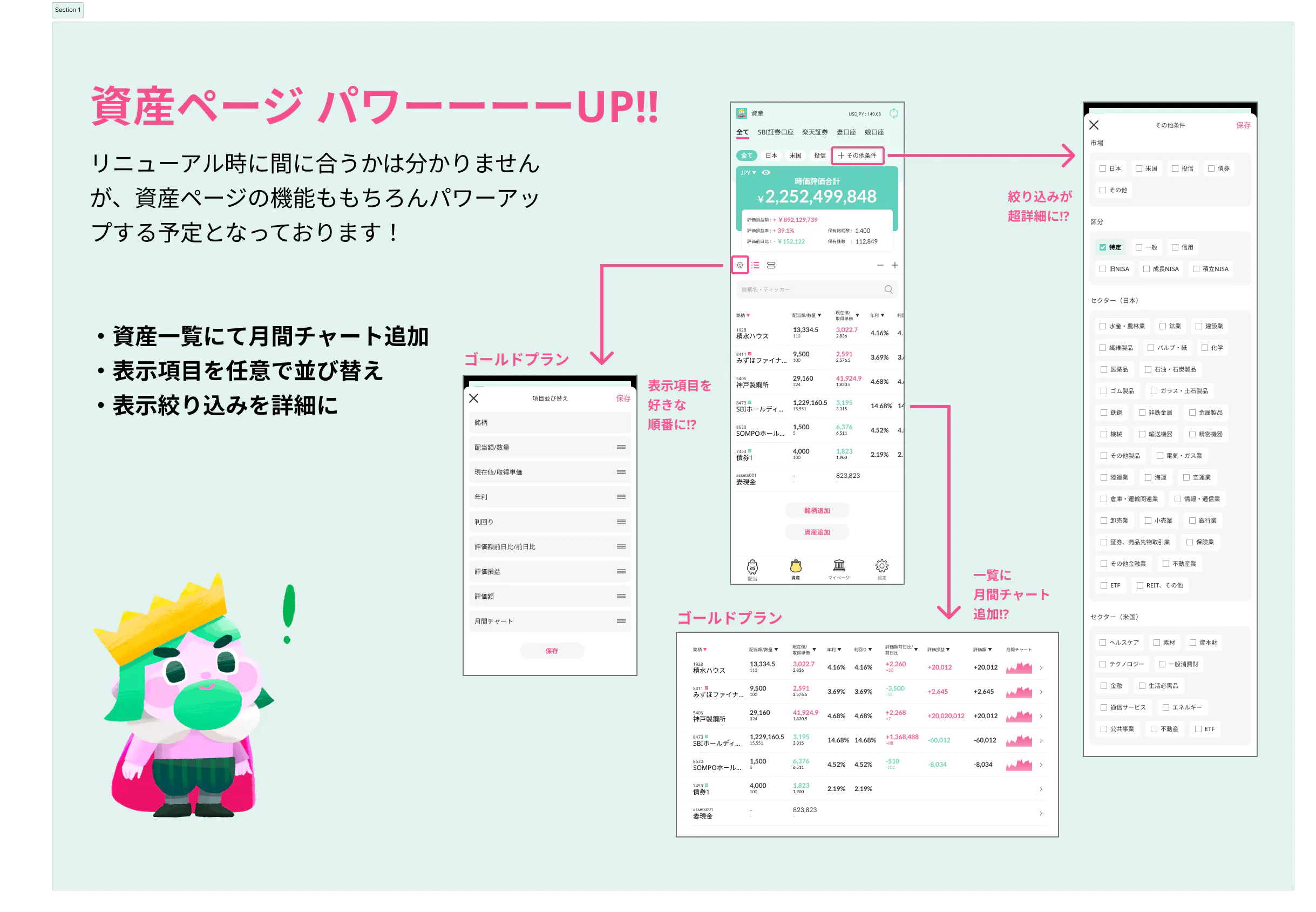 その中で資産ページでは表示項目の追加・並び替え。そして絞り込みもかなり細かいところまで、リニューアル時に間に合うかは別としてできるようになる予定です。