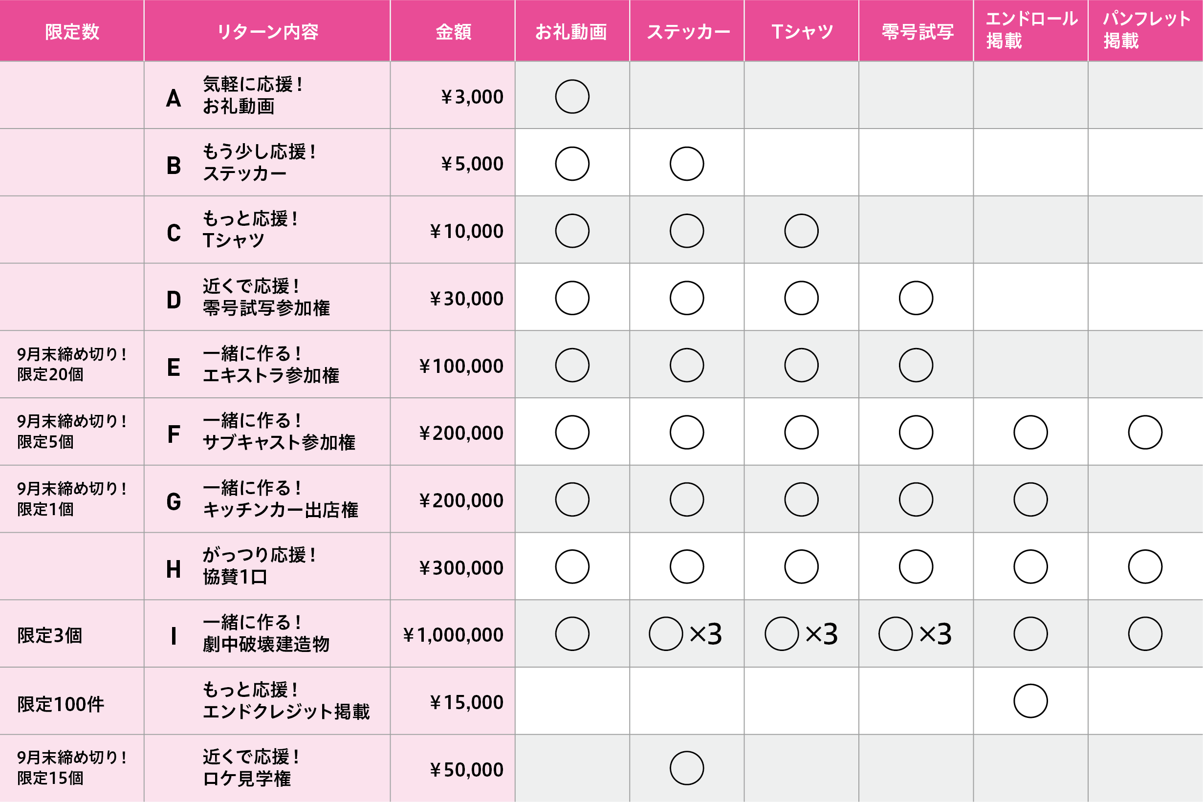 ロケ見学の他、エキストラやサブキャストでの参加権(9月末締め切り)や、零号試写会参加権など、一緒に映画を作ったり、その過程に立ち会って頂けたりできればと思っています。