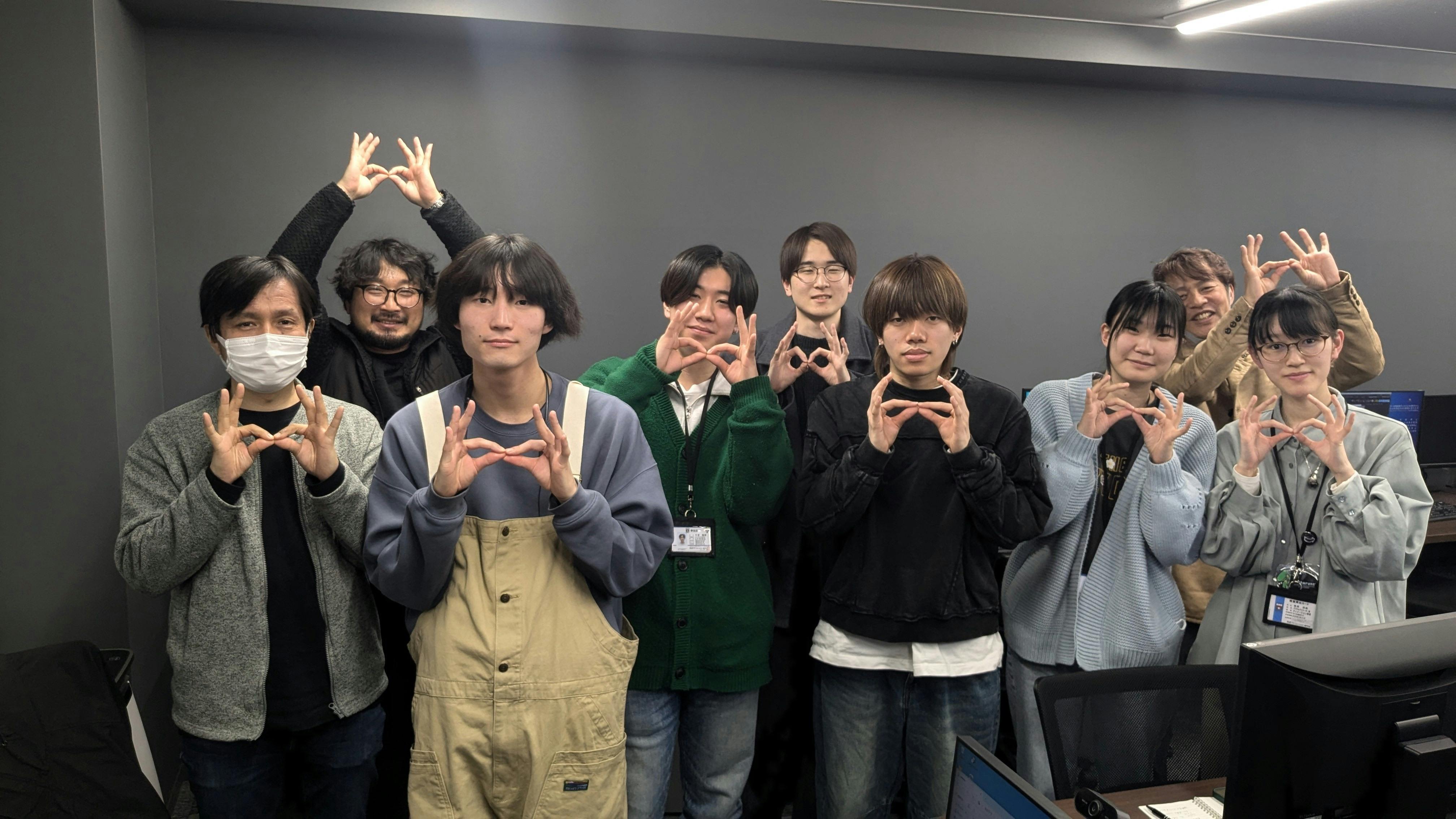 写真は「見え見え」のVFXチームです。CS.2の皆さんと、お手伝い頂いている名古屋デザイン&テクノロジー専門学校の皆さんです!