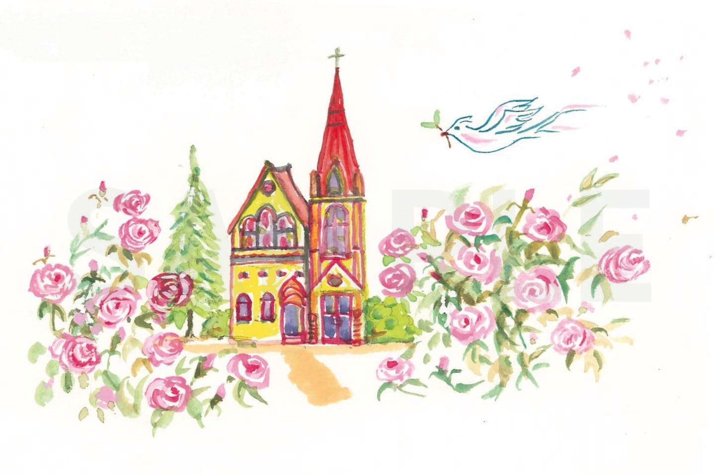絵の中にバラと教会、そして平和の象徴である鳩がくちばしに双葉を加えていました。