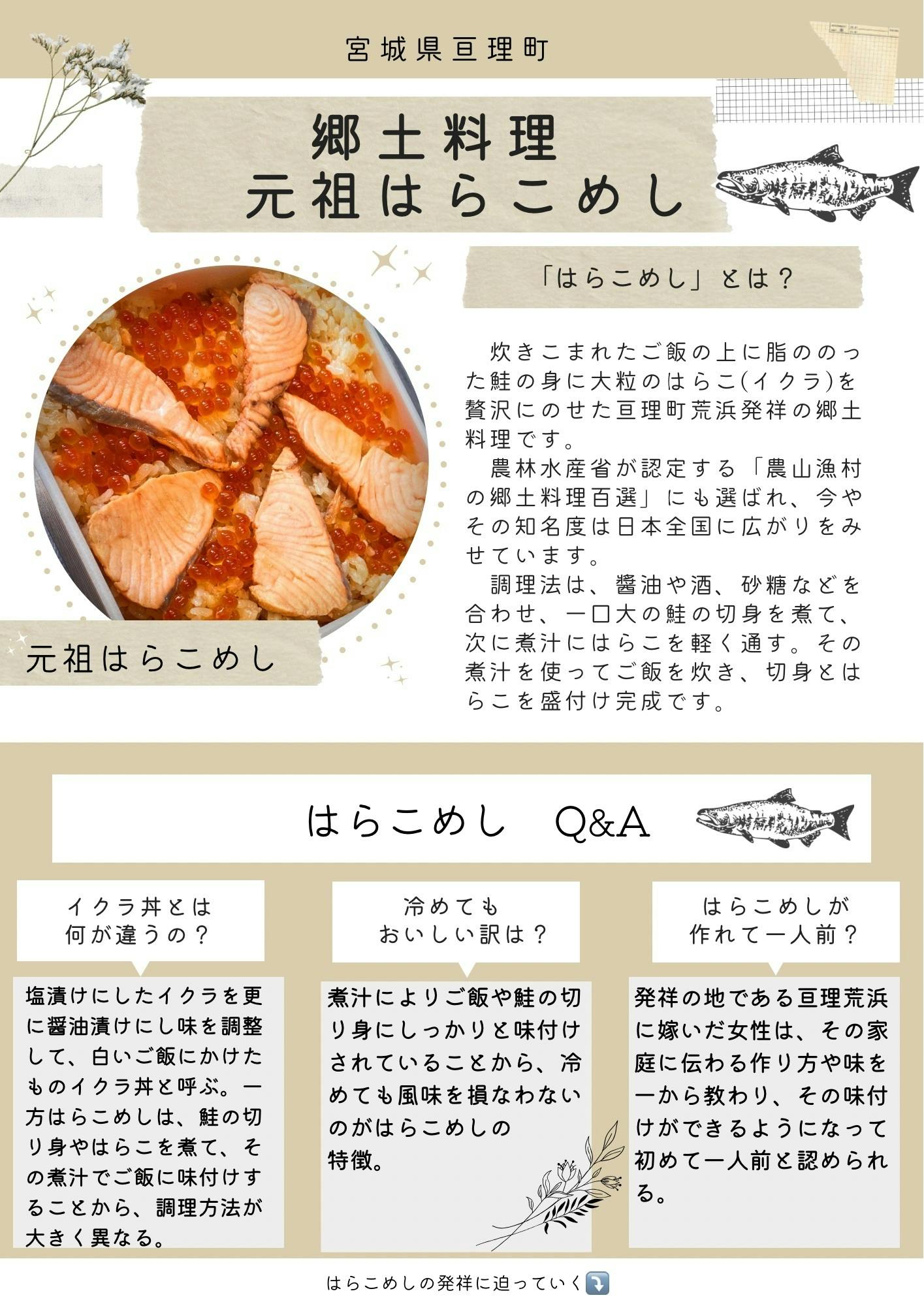 「はらこめし」は、宮城県亘理町の郷土料理で、その歴史は120年以上にわたります。しかし、近年では食文化の多様化や生活様式の変化により、若い世代にその魅力が伝わりにくくなっていると考えています。また、近年は海水温の上昇が原因となり、地元亘理荒浜漁港での鮭の水揚げがほとんどなくなっているのが現状です。町内飲食店は北海道産の秋鮭で対応しているものの、このままでは食文化を維持していくこと自体困難となってきています。