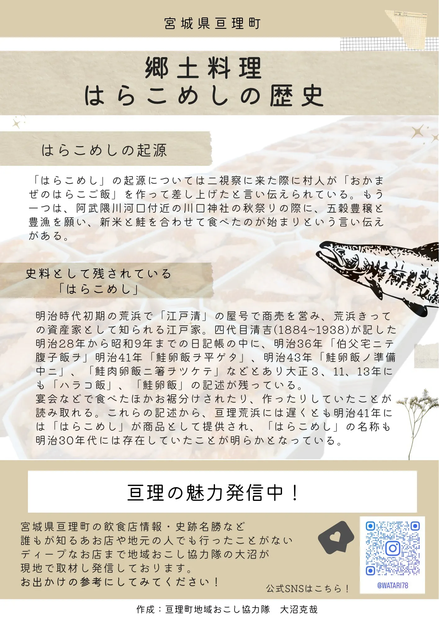 昨年、亘理町の郷土資料館にてはらこめしの資料を閲覧しはらこめしの歴史を周知するチラシの作成、配布を行った。