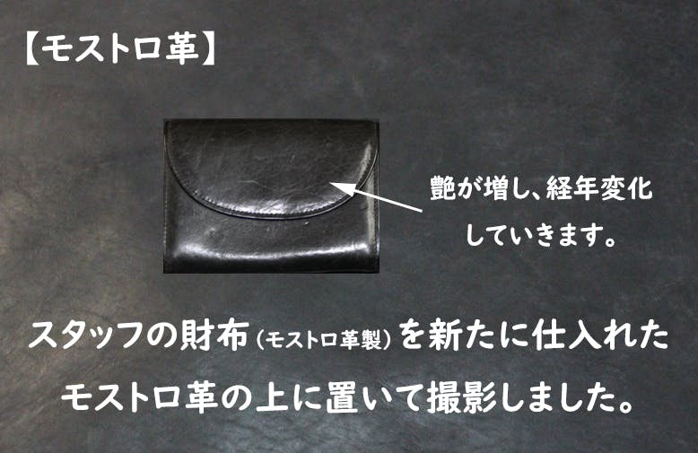 この革、【モストロ】と命名されています。モストロとはイタリア語でモンスターの意味で最初はマットな表情ですが使い込むほどに艶が出る、 まさに「化ける」と言える劇的な経年変化を味わうことができるレザーなんです。