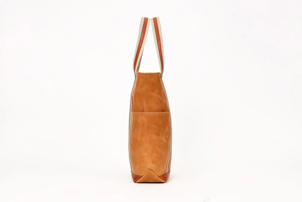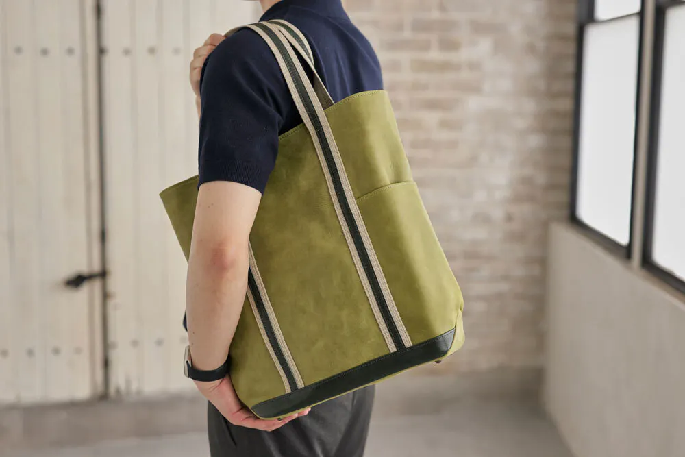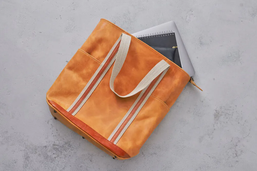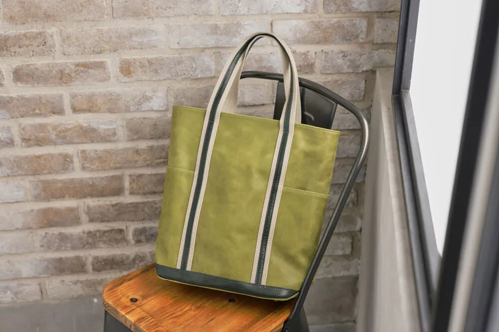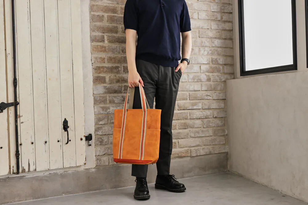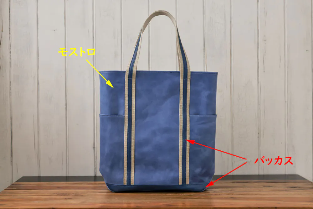 このバッグ実は、モストロとバッカスという2種類の革を使っています。どちらも化けるのが得意な革で、アクセントをつけるためにこの2種類の革を使い濃淡を表現しました。モストロ革の色がだんだんバッカスの色に近づいていき、バッカスもまた経年変化していきます。