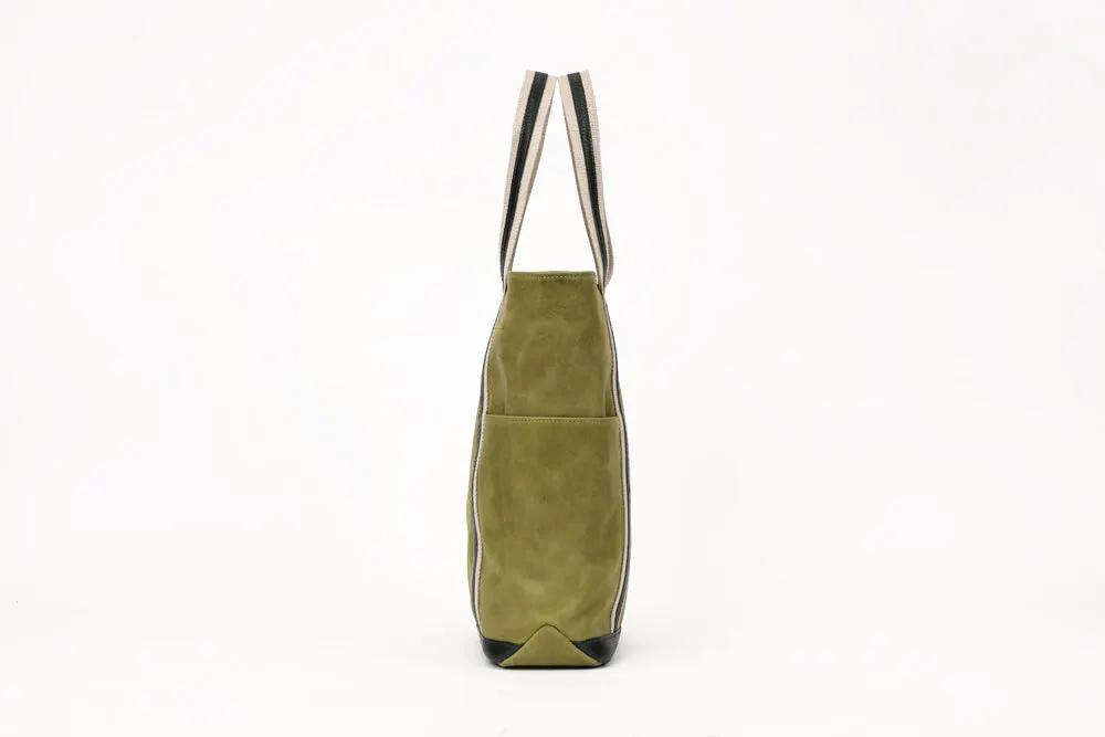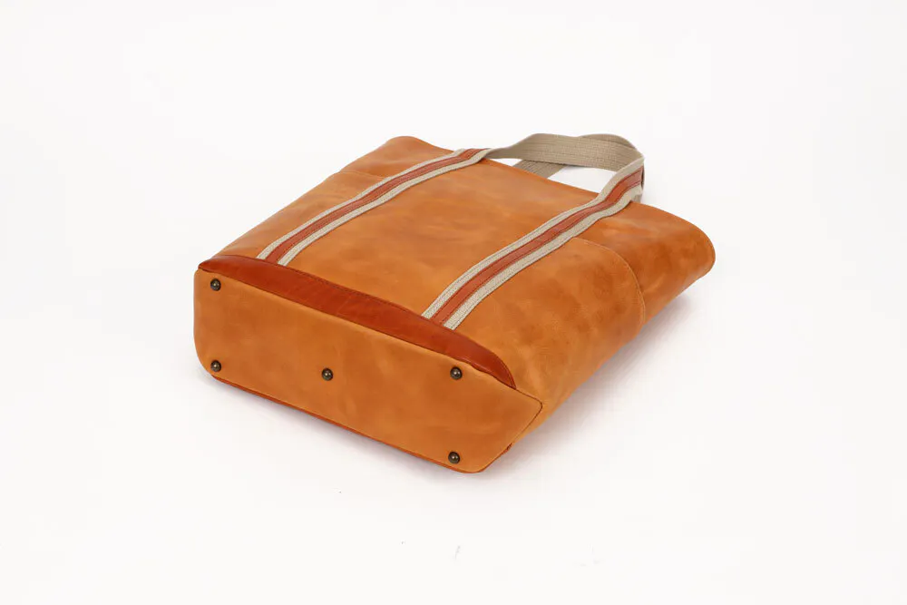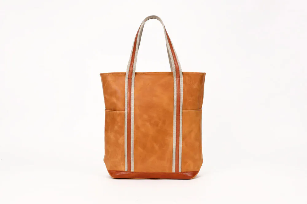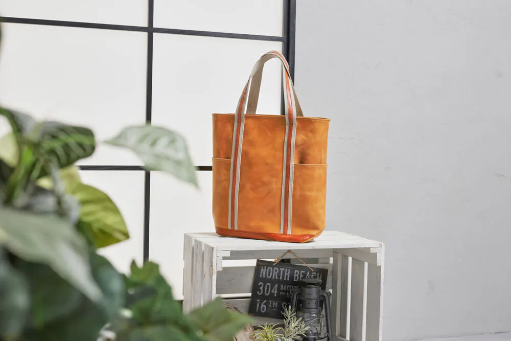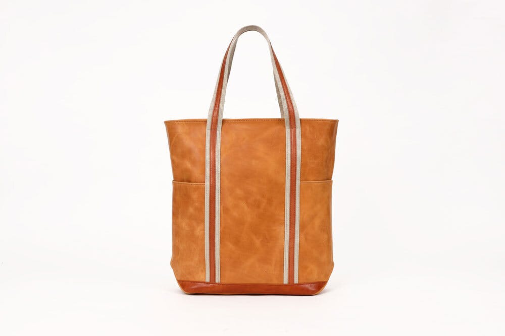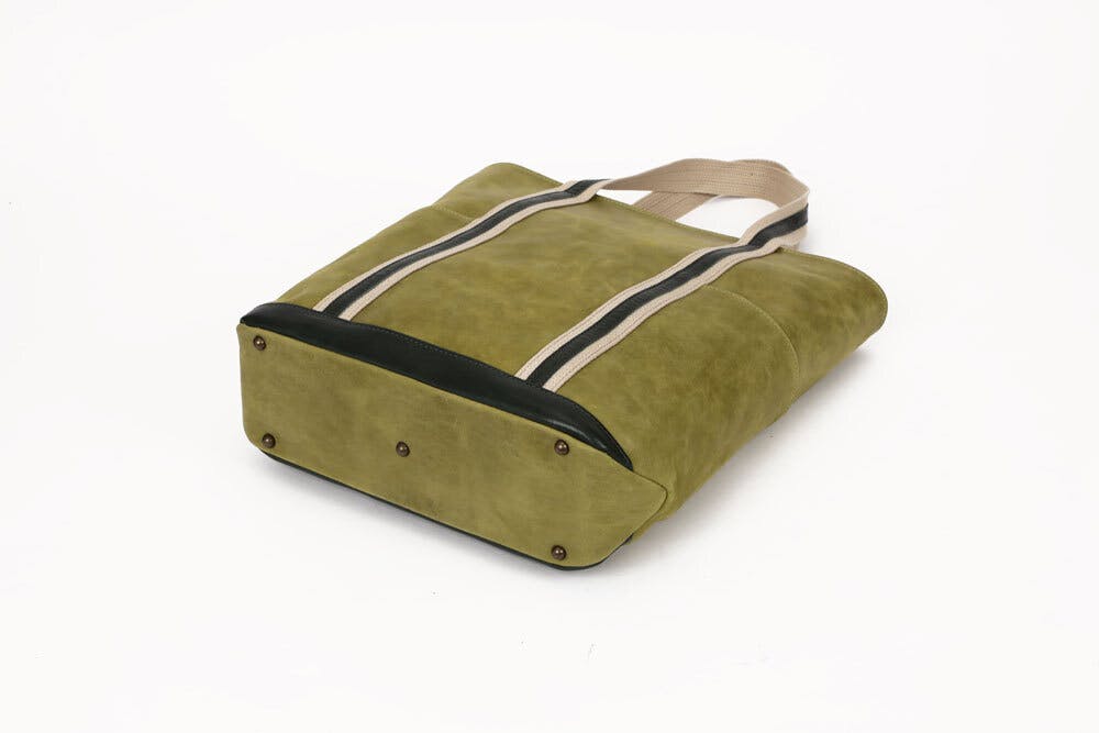 このバッグ実は、モストロとバッカスという2種類の革を使っています。どちらも化けるのが得意な革で、アクセントをつけるためにこの2種類の革を使い濃淡を表現しました。モストロ革の色がだんだんバッカスの色に近づいていき、バッカスもまた経年変化していきます。