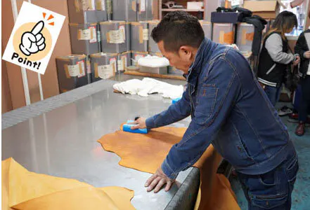 ▷モストロ革の最後の仕上げは手作業で1枚1枚丁寧に