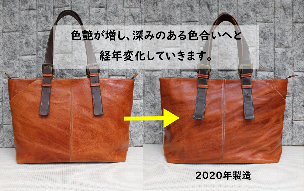 育つ過程が楽しめる革であり、使い込むことでより美しく、味わいが出て、色艶が増し、深みのある色合いへと経年変化していきます。