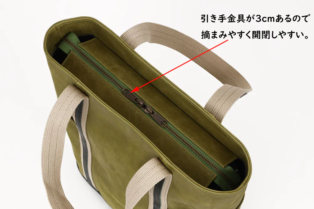 ファスナーを最後まで開けると中身がひと目でわかり出し入れしやすい。