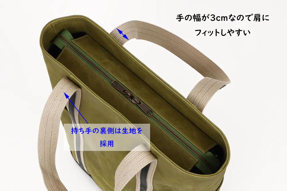 ▷持ち手の裏側は生地なので肩に掛けた時ズレ落ちにくい