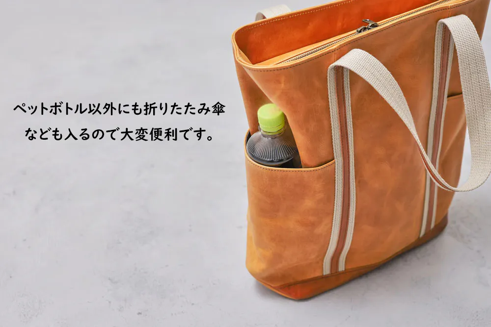 ▷バッグ外側の両マチ部分にペットボトルがすっぽり入るポケット付き