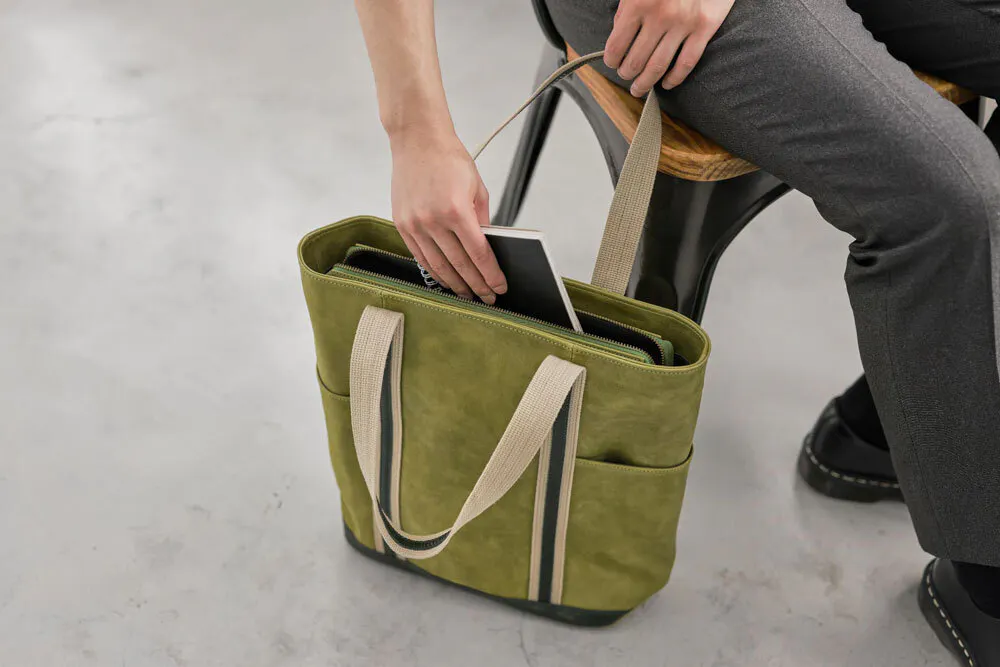 肩に掛けたままさっと取り出すことができ、左右どちらの肩に掛けてもポケットから取り出せる設計にしました。両マチポケットにはハンカチやパスケースなど入れておくのも◎